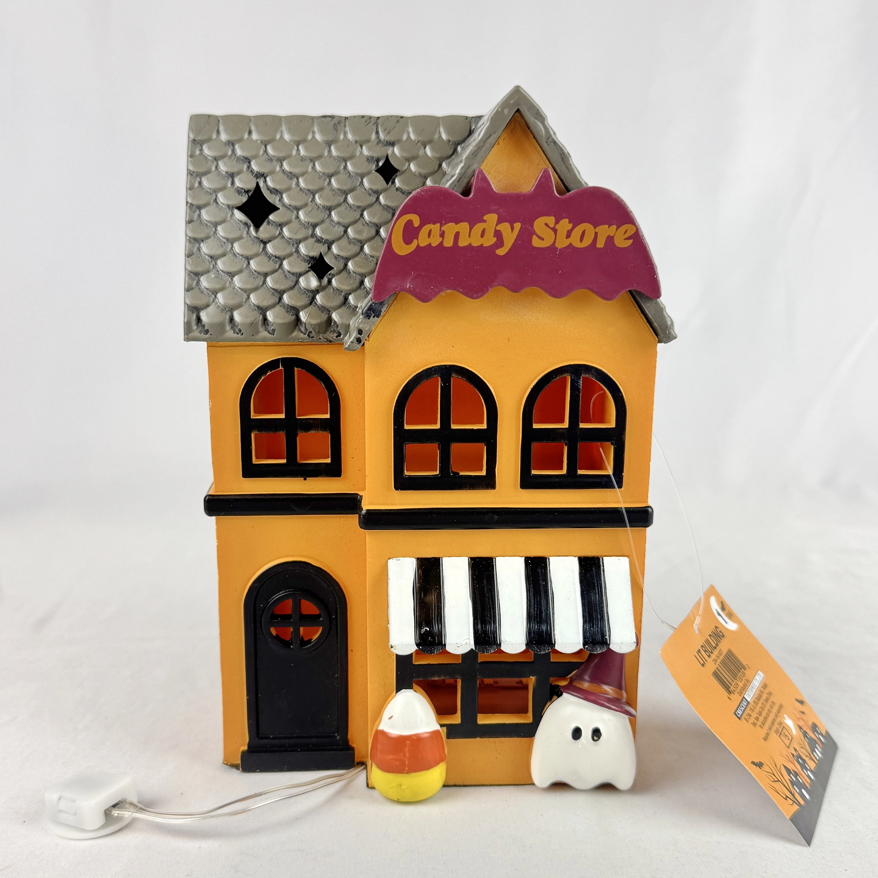 Add a festive glow to your Halloween setup with this 2023 Target Bullseye Playground Candy Store lighted building! Featuring a bright orange facade, arched windows, black shingled roof with star cutouts, a striped awning, candy corn, and a ghost in a purple witch hat—this piece is full of charm and Halloween spirit.
