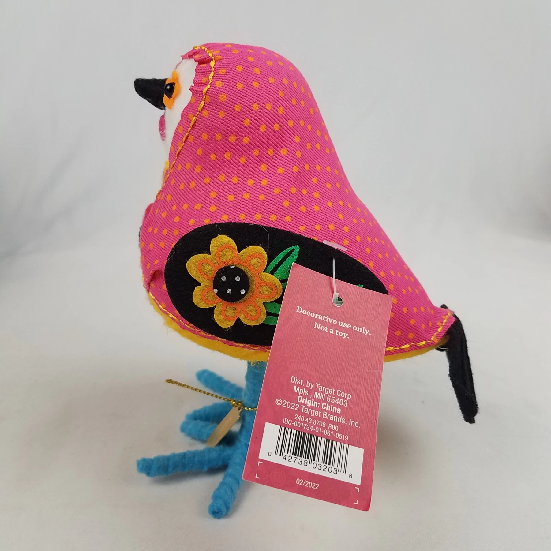 Made with Styrofoam and fabric, this calavera bird comes in blue, pink and white hues with blue legs for an eye-catching look.