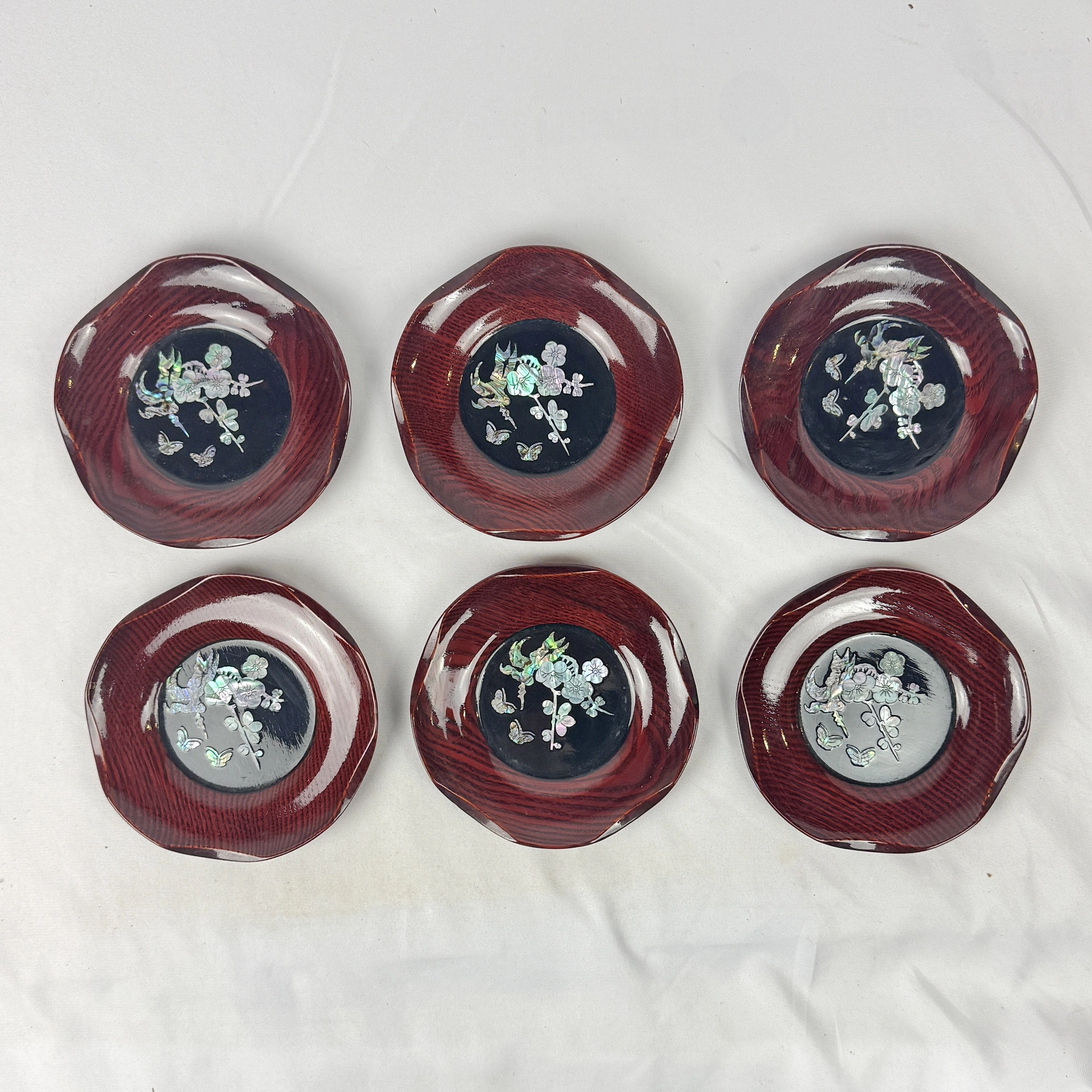 Cherry Wood Coasters with Mother of Pearl Inlay Floral Butterflied Set of 6