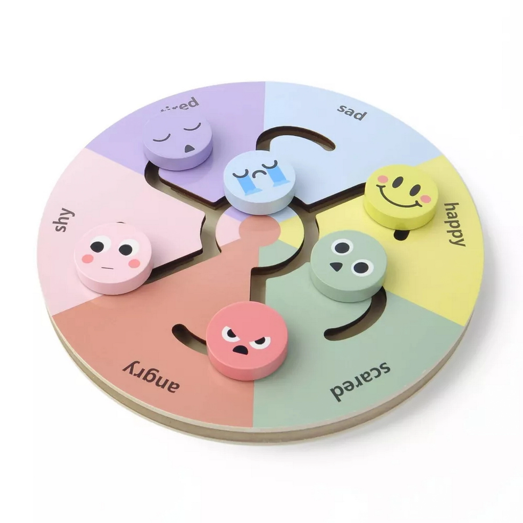A wooden toy designed to help children learn about and express emotions. The toy is a circle with different emotion faces displayed, and children can move a marker to indicate how they are feeling.