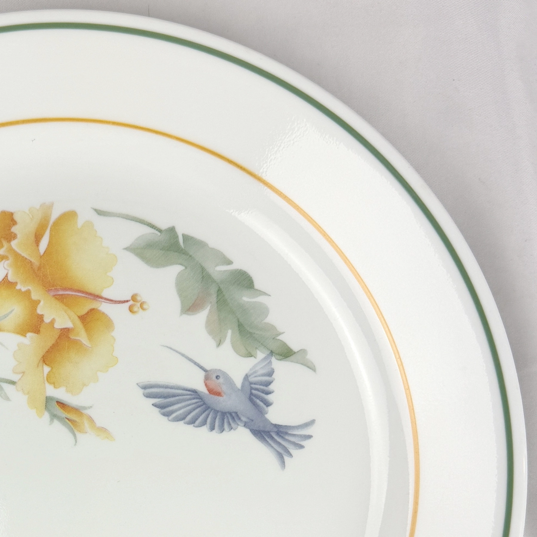 Vintage Corelle Corning dinner plate featuring hummingbird and yellow flower design. White background with green and gold trim. Durable glass plate, perfect for collectors, everyday use, or replacing broken pieces in your Corelle set.
