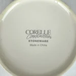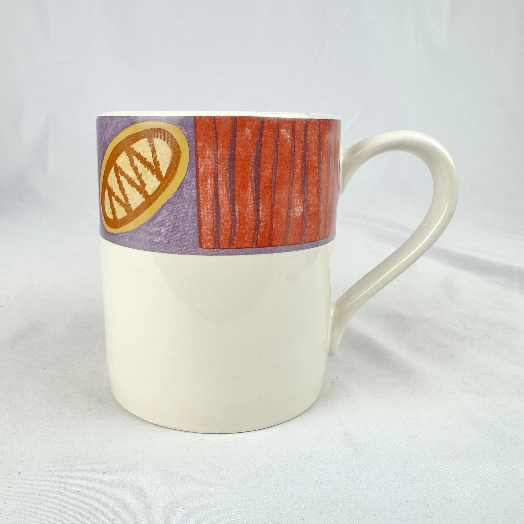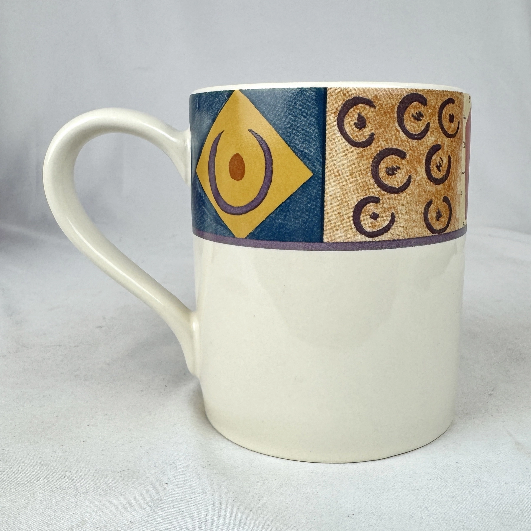 Vintage Corelle Tribal mug, featuring bold geometric tribal-inspired multicolor border in red, blue, yellow, and purple on white. Made of stoneware. Corelle Expressions pattern, discontinued and hard to find, perfect for replacement, retro table settings, or Corelle collectors.
