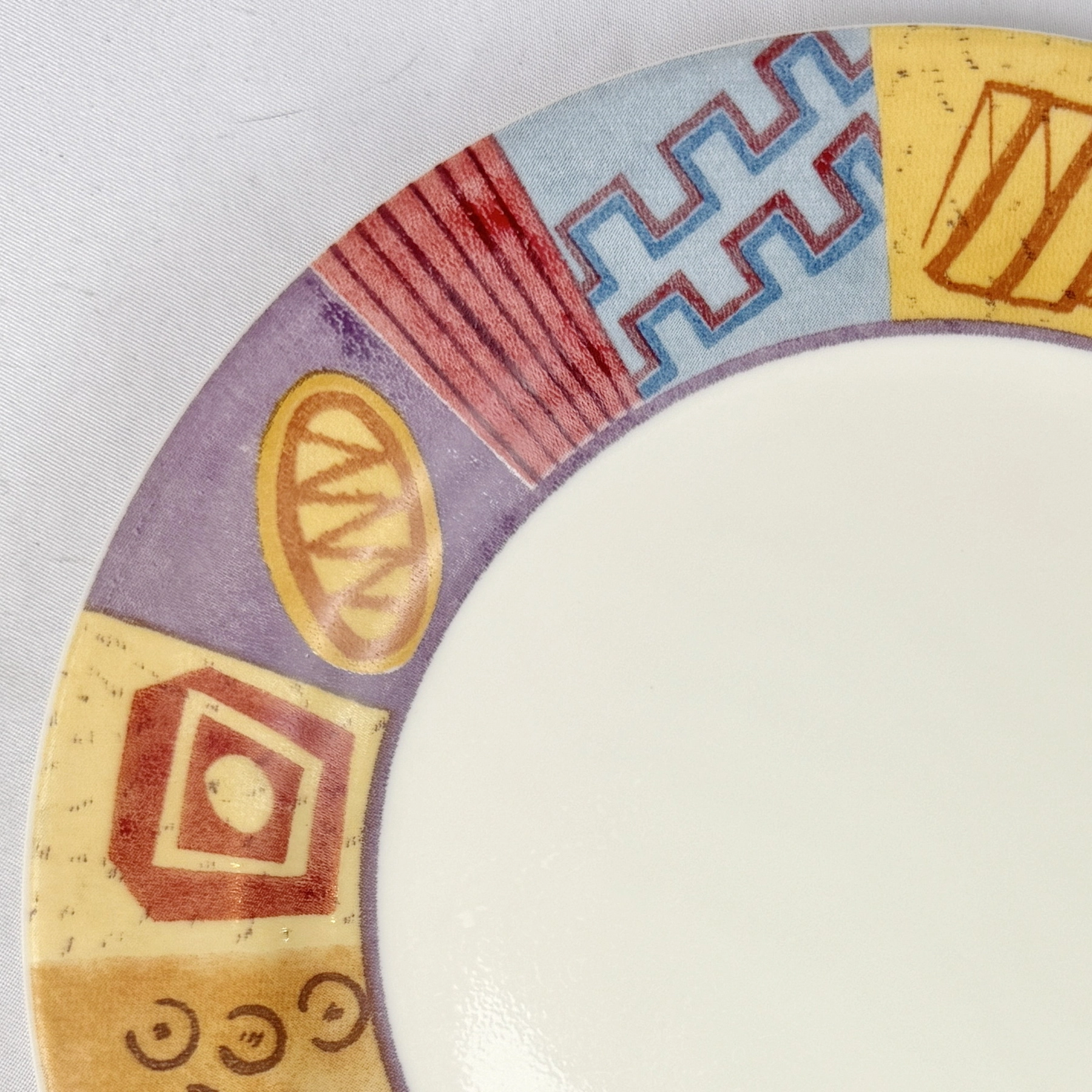 Corelle Coordinates stoneware salad/dessert plate featuring a colorful geometric block design with red, yellow, blue, and purple accents. Measures approx. 7.25 inches in diameter. Durable, dishwasher and microwave safe. Great for collectors, replacements, or retro dinnerware sets.