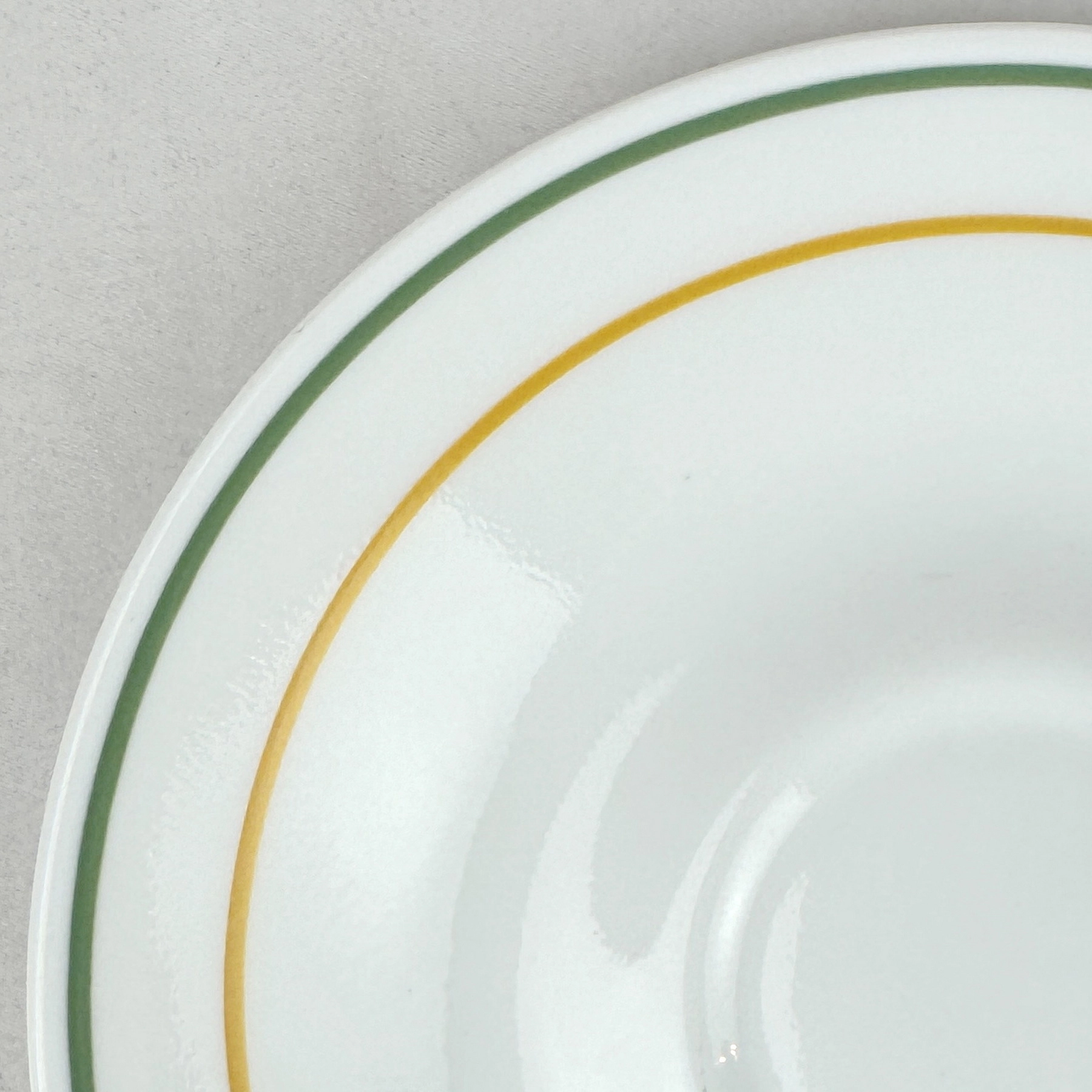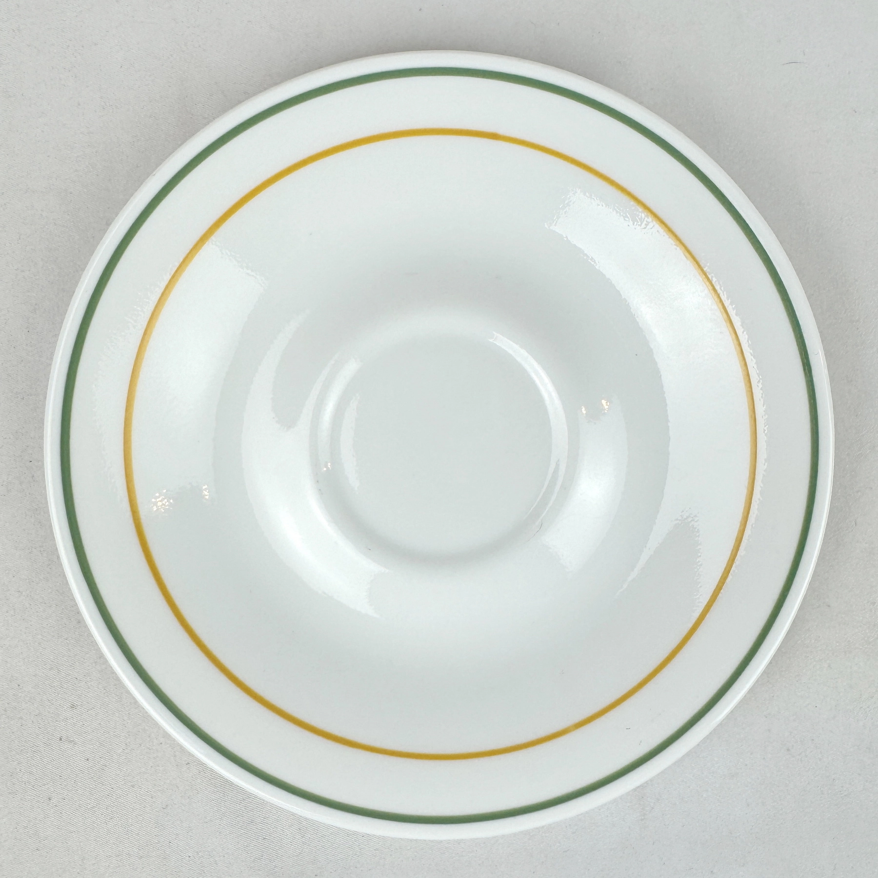 Classic Corelle saucer with green and gold rim bands. Durable Vitrelle glass, lightweight, chip resistant, microwave and dishwasher safe—perfect replacement or addition to your Corelle set.