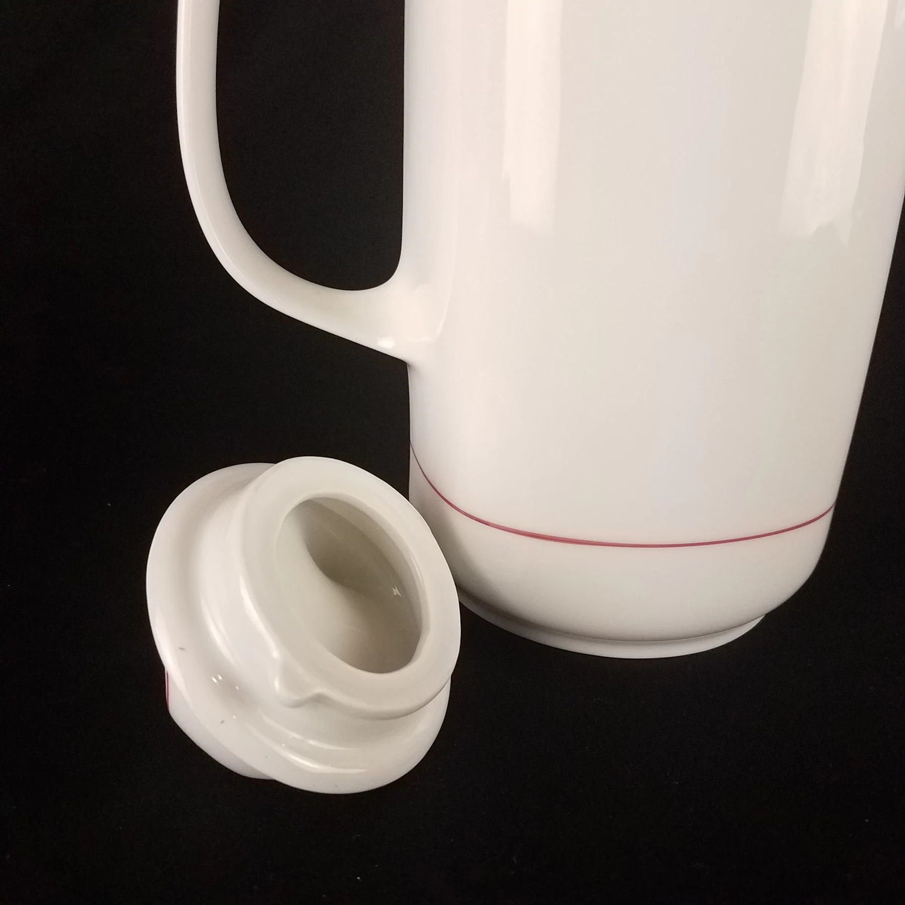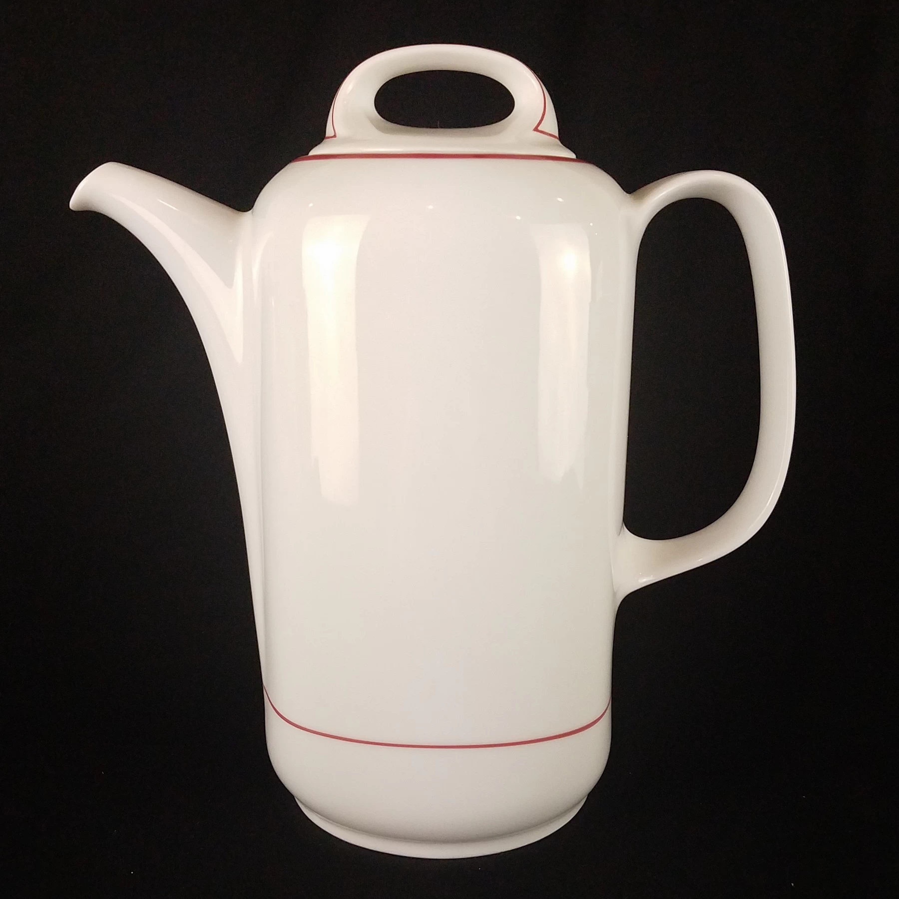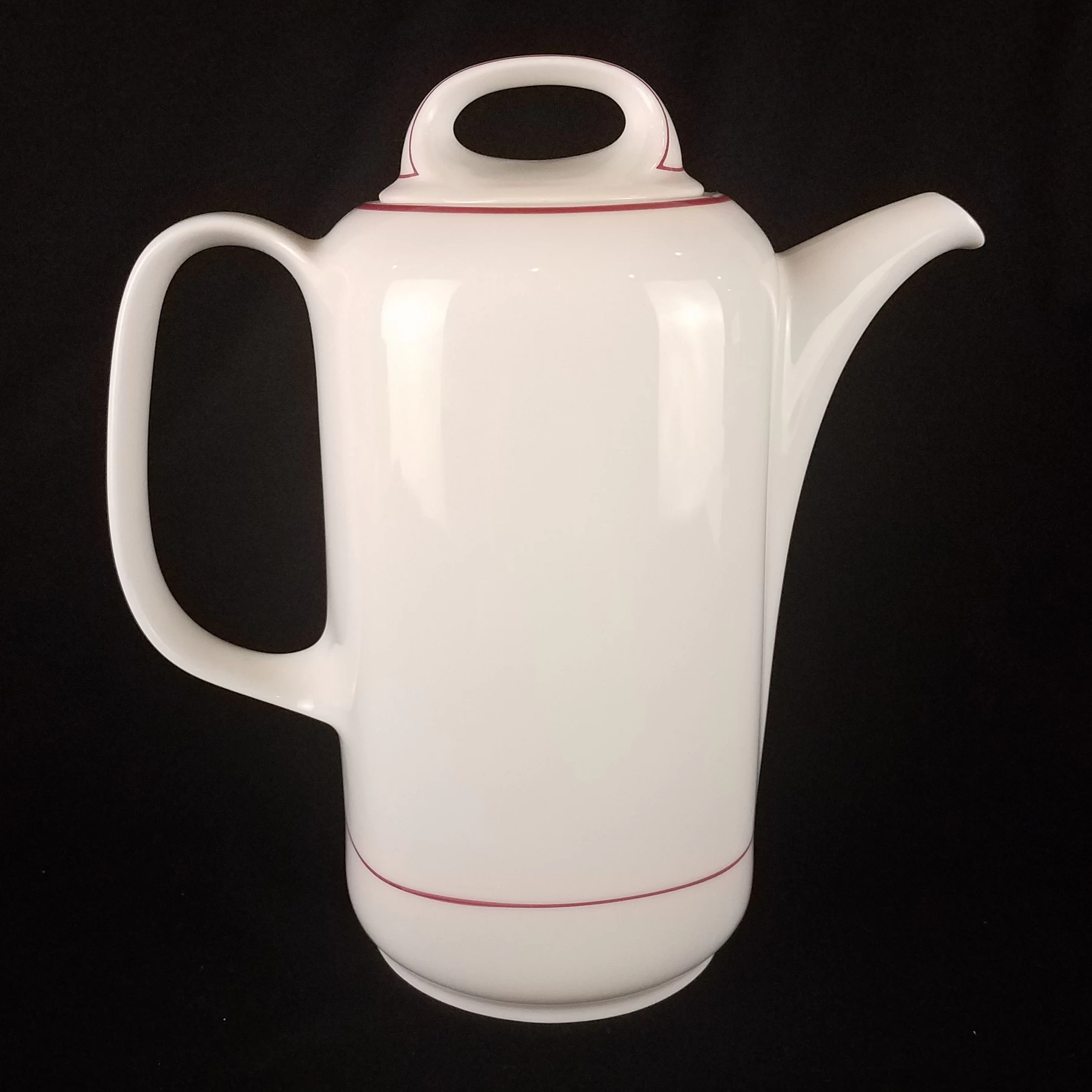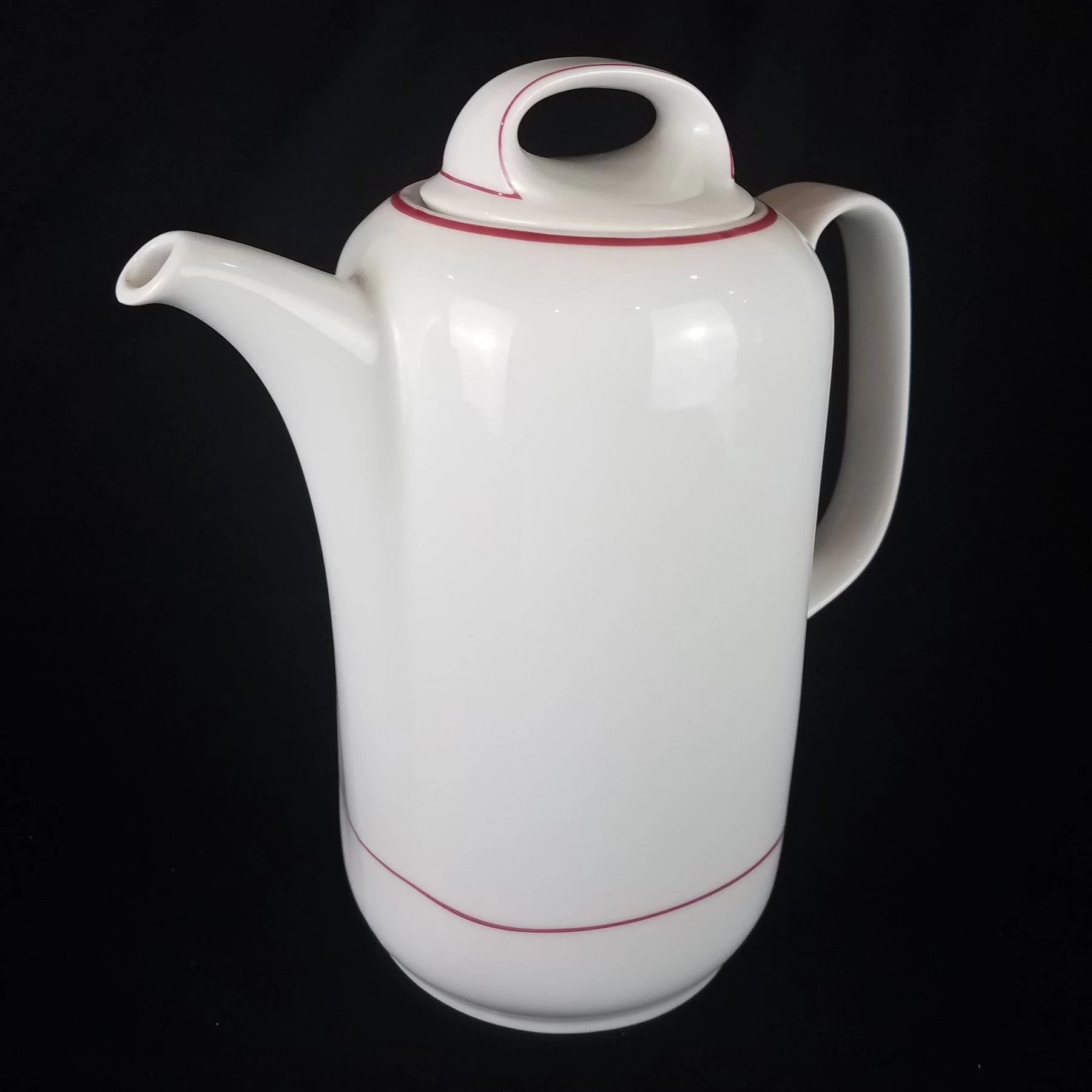 Beautiful Mid-century teapot, white quality porcelain by Eschenbach. Brilliant smooth white with accents of red lines.