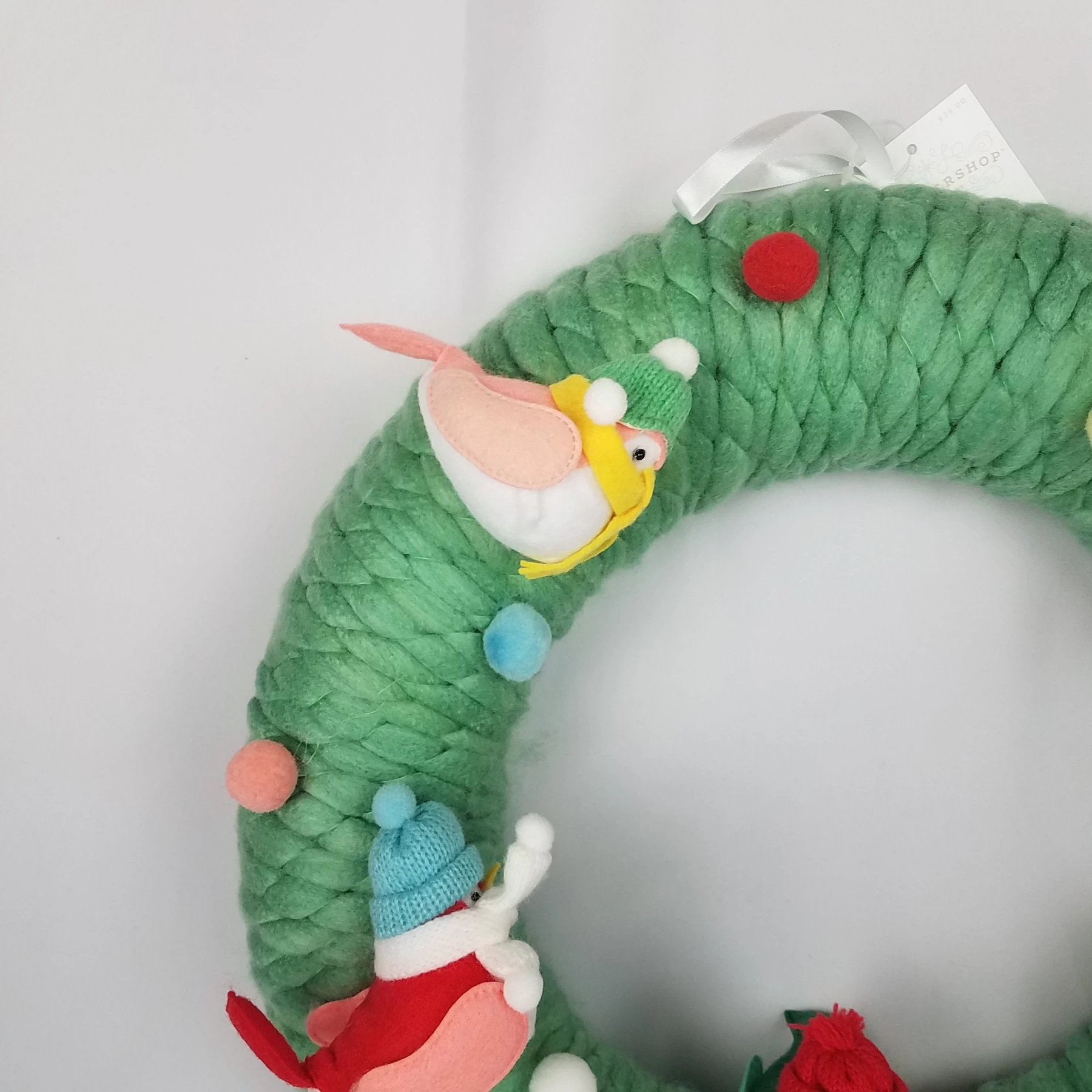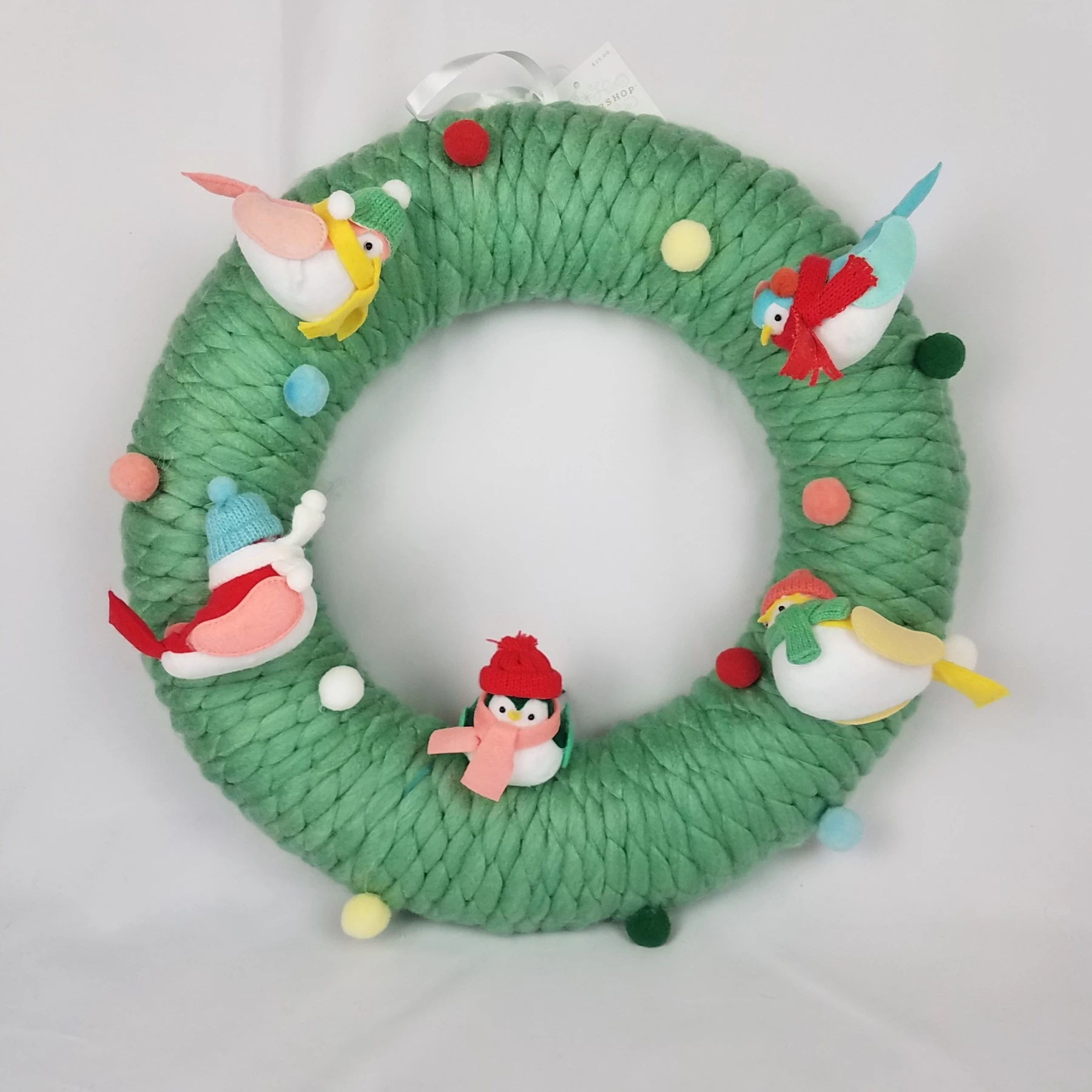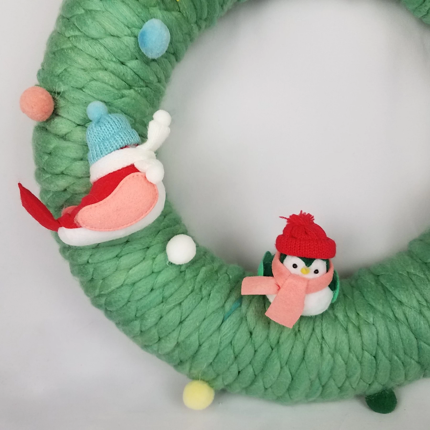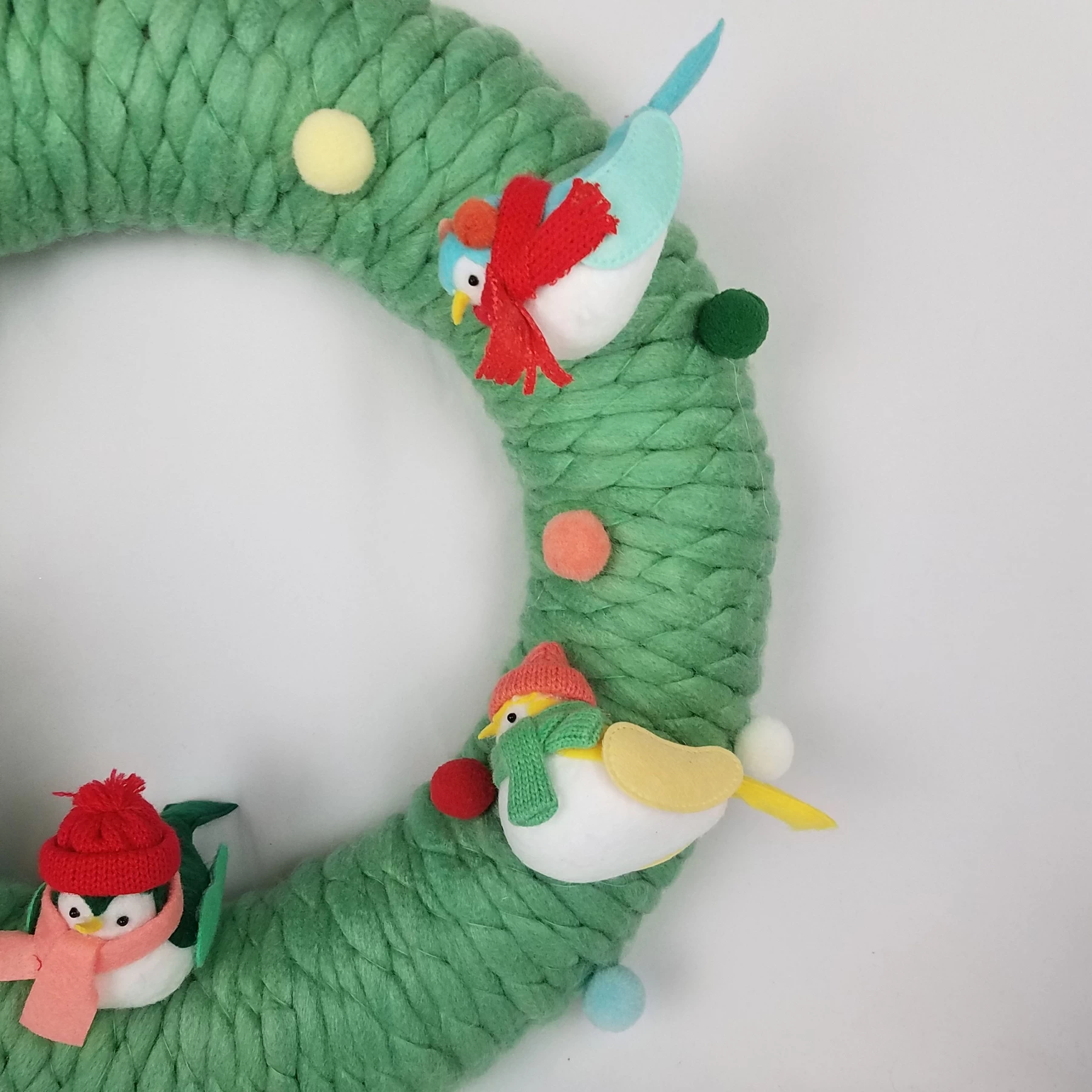 Add a sweet finish to your Christmas decor with this Featherly Friends Fabric Bird Decorative Wreath. This circular fabric wreath features a green textured construction and is decorated with colorful pompom accents and birds decked in beanie hats and knitted scarves for added harm. Complete with a top hanging loop suitable for wall display.