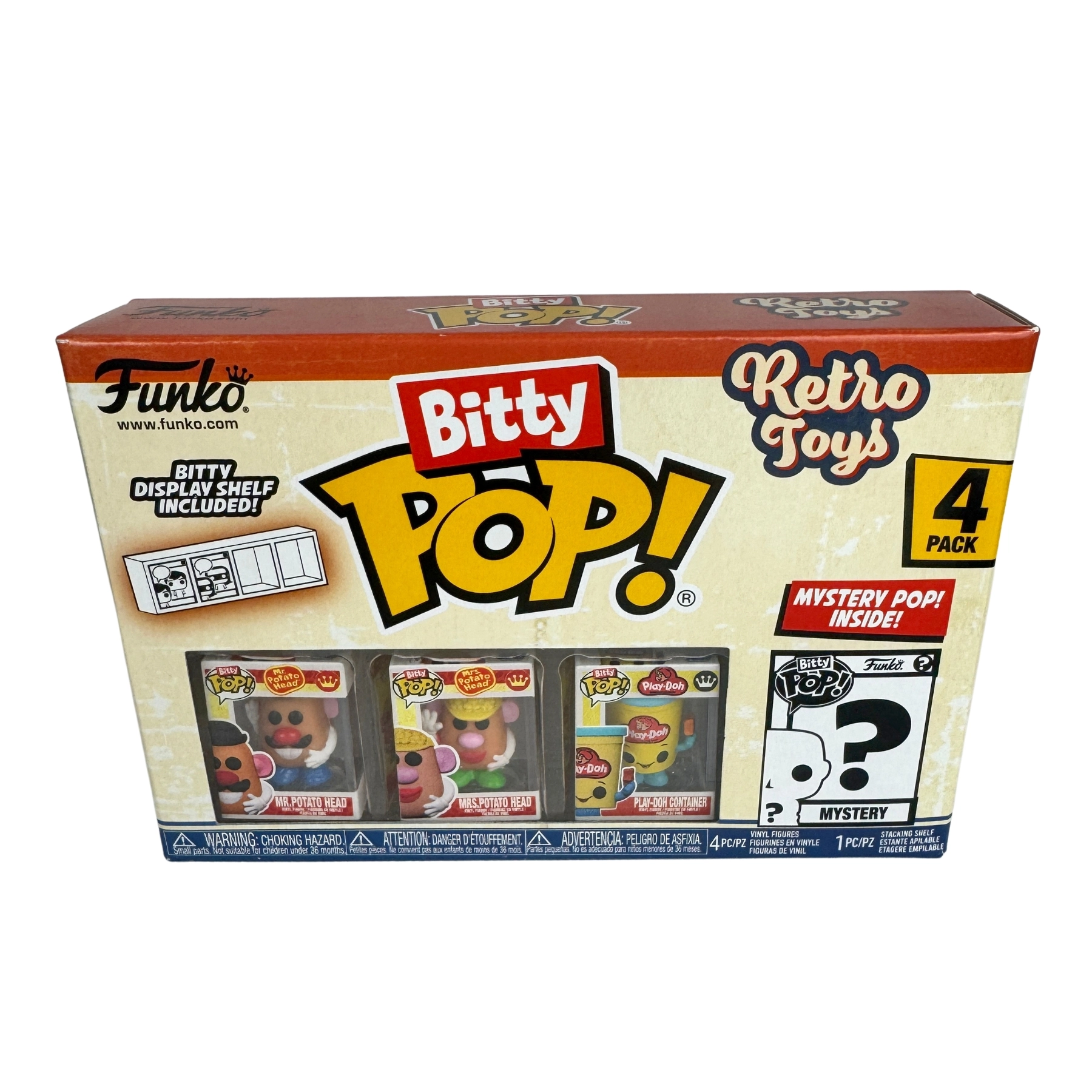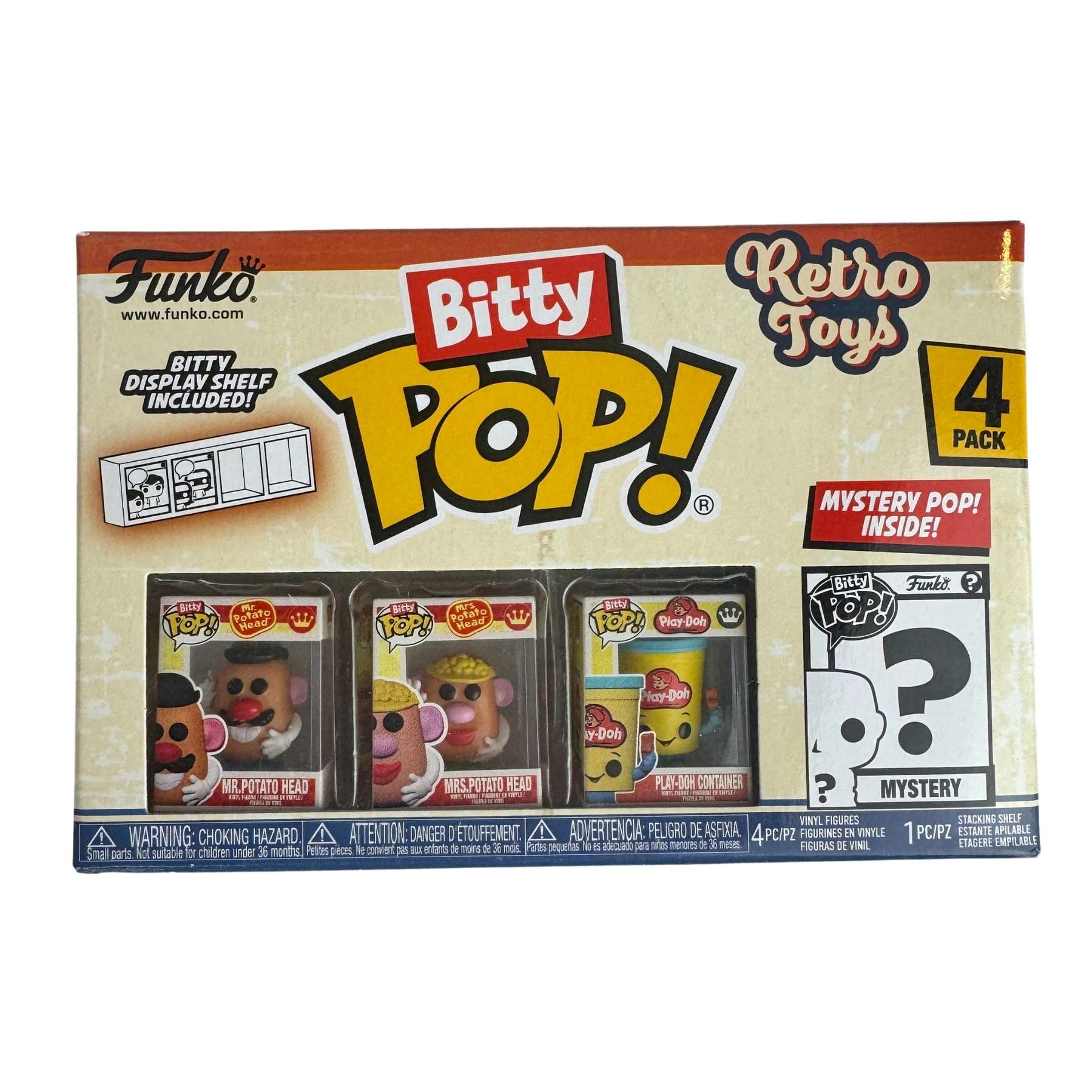 This 4-pack includes Bitty Pop! Mr. Potato Head, Mrs. Potato Head, Play-Doh Container and a mystery Bitty Pop! figure. The possible mystery Bitty Pops! are Soundwave, Dr. Mindbender (chase), Cavity Sam, and Lite-Brite.