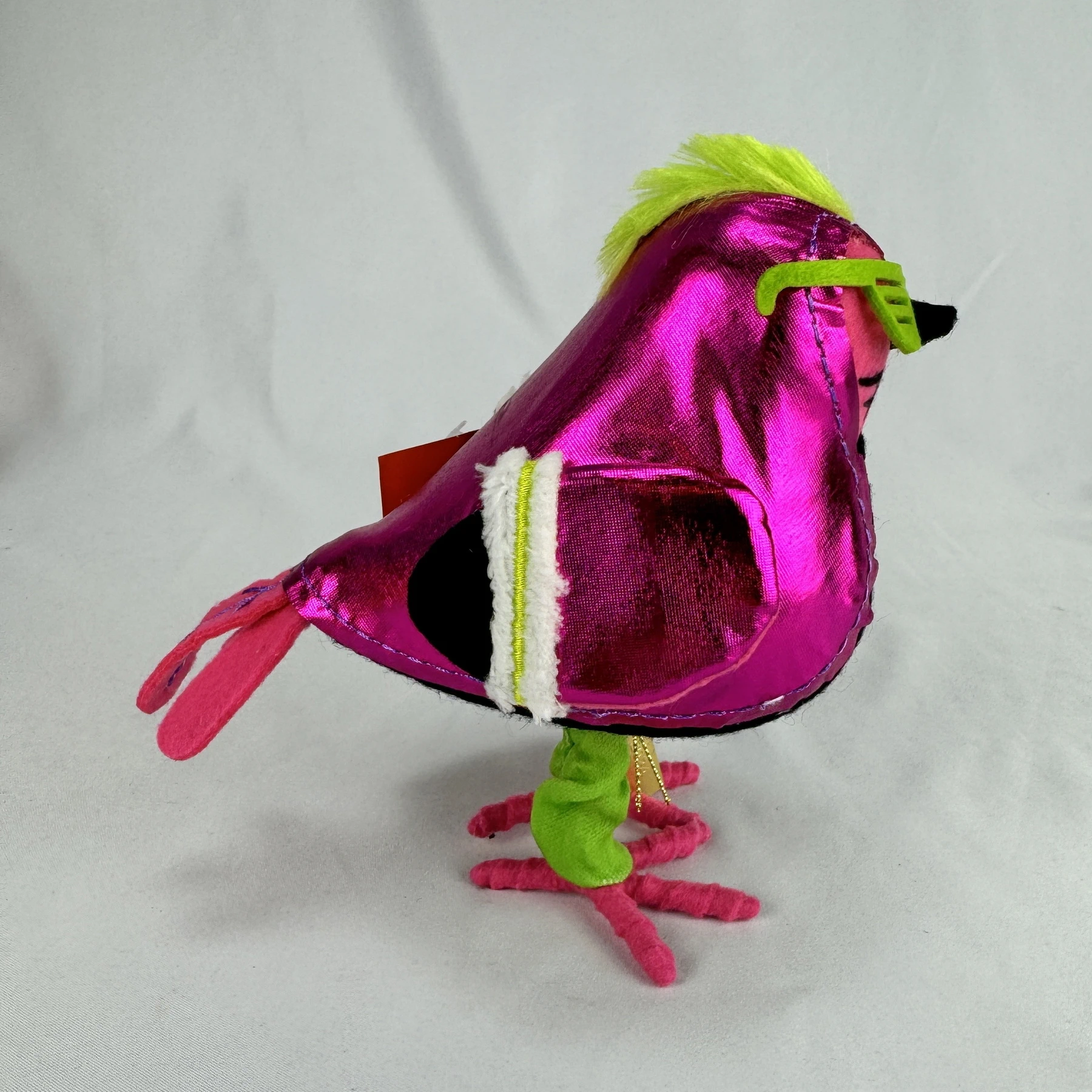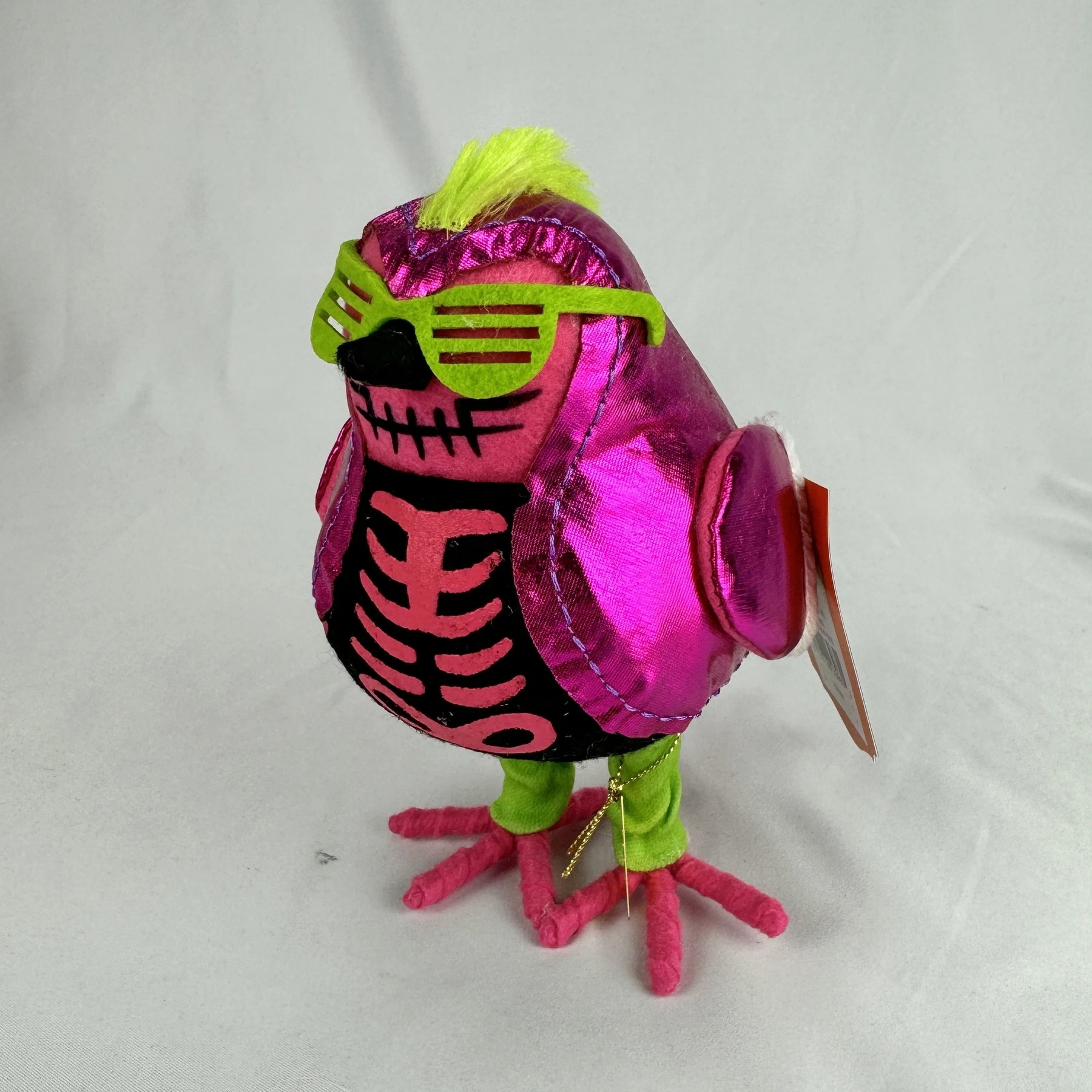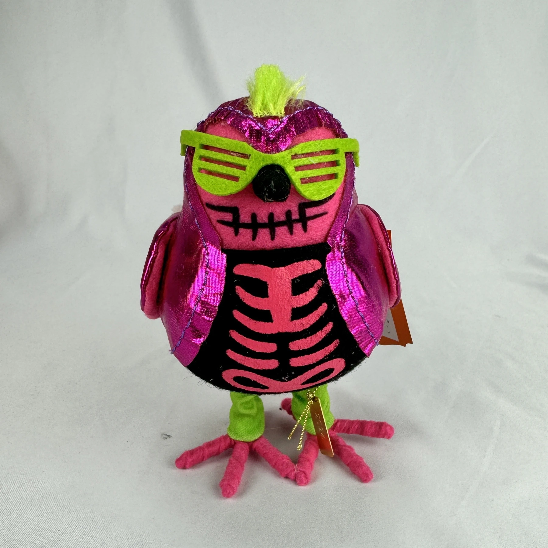 Featuring a freestanding design, this decorative Halloween figurine features a punk rocker bird with skeleton face accents and green mohawk hair for whimsical flair.
