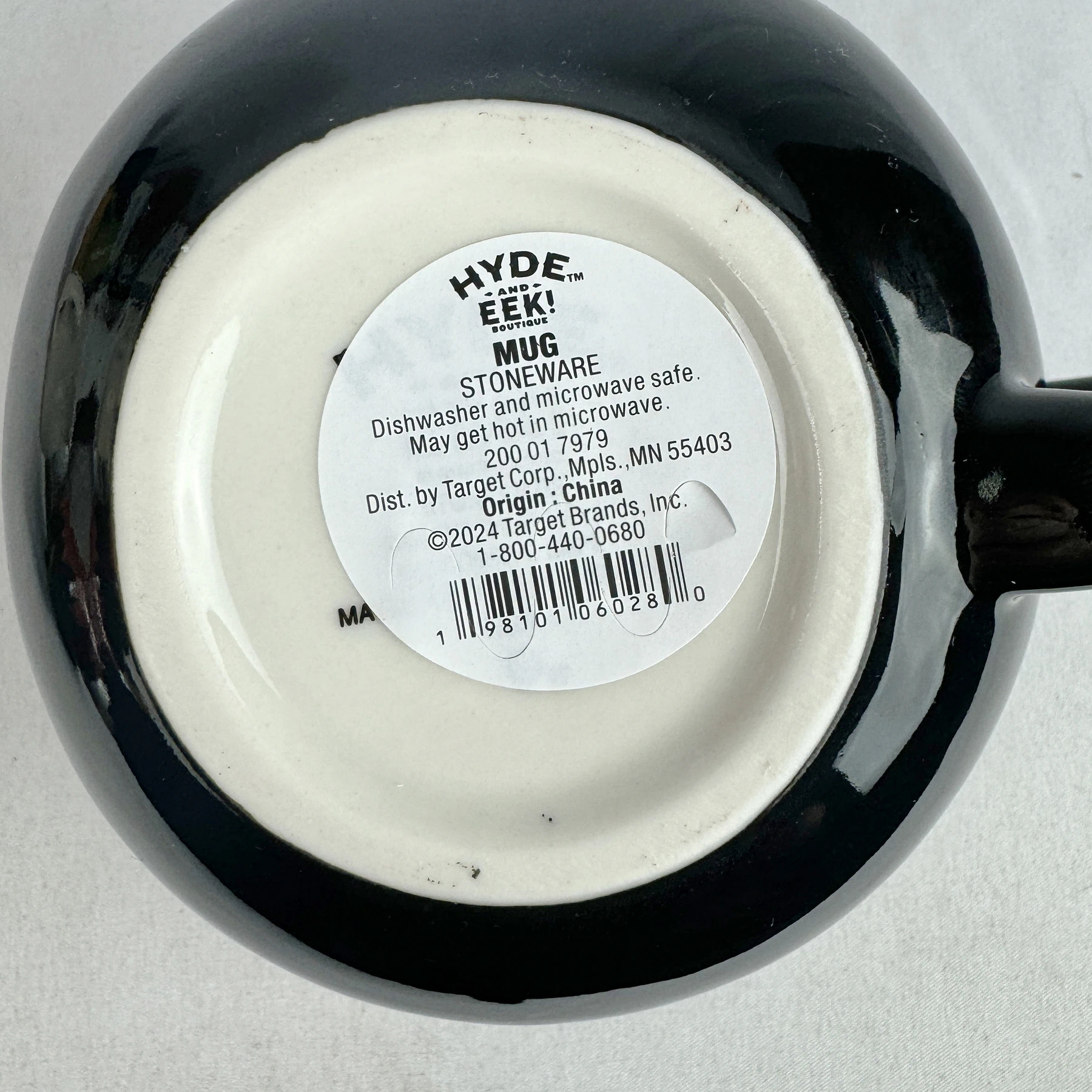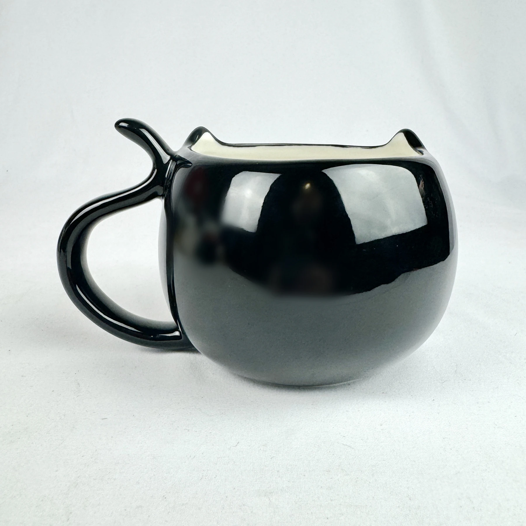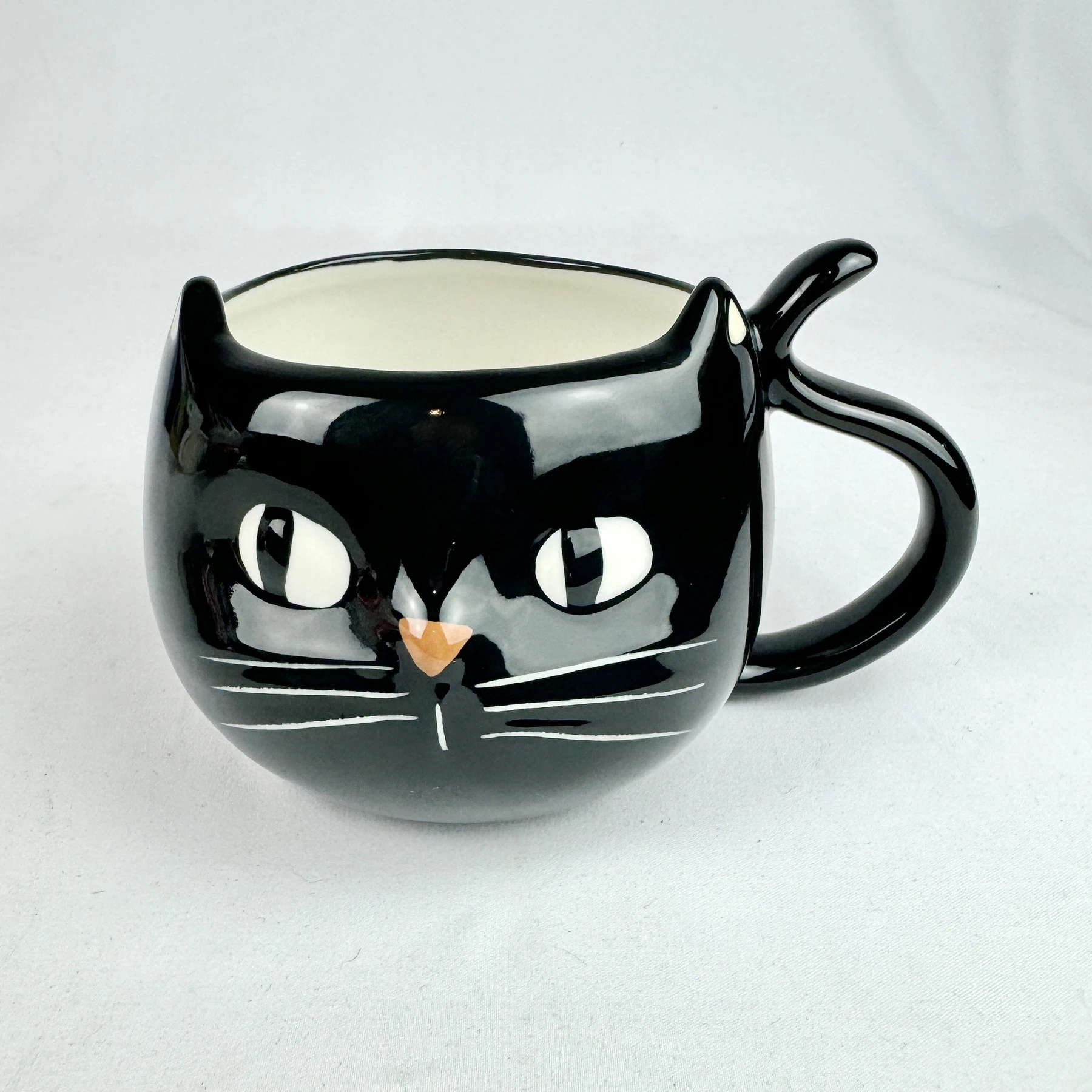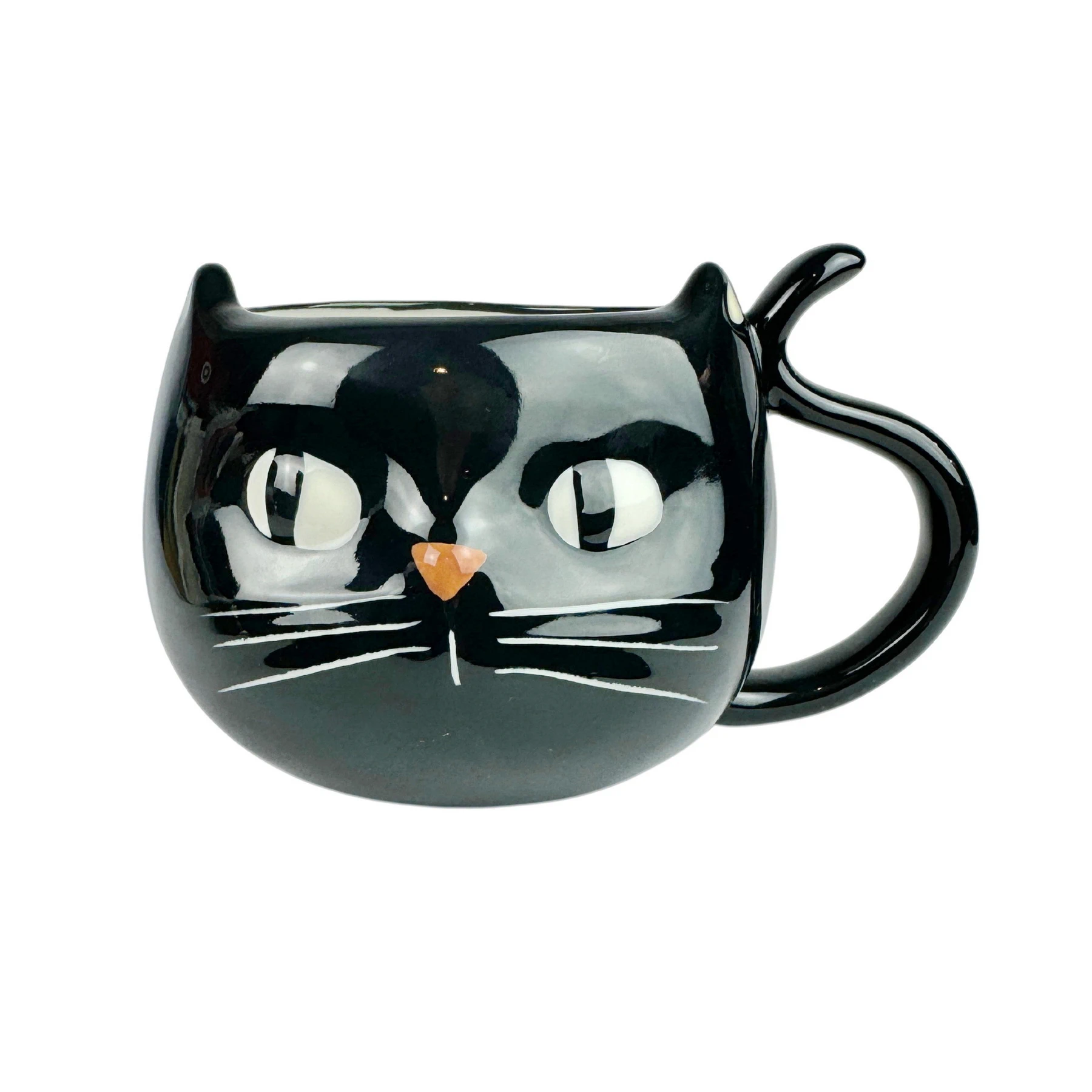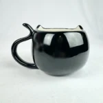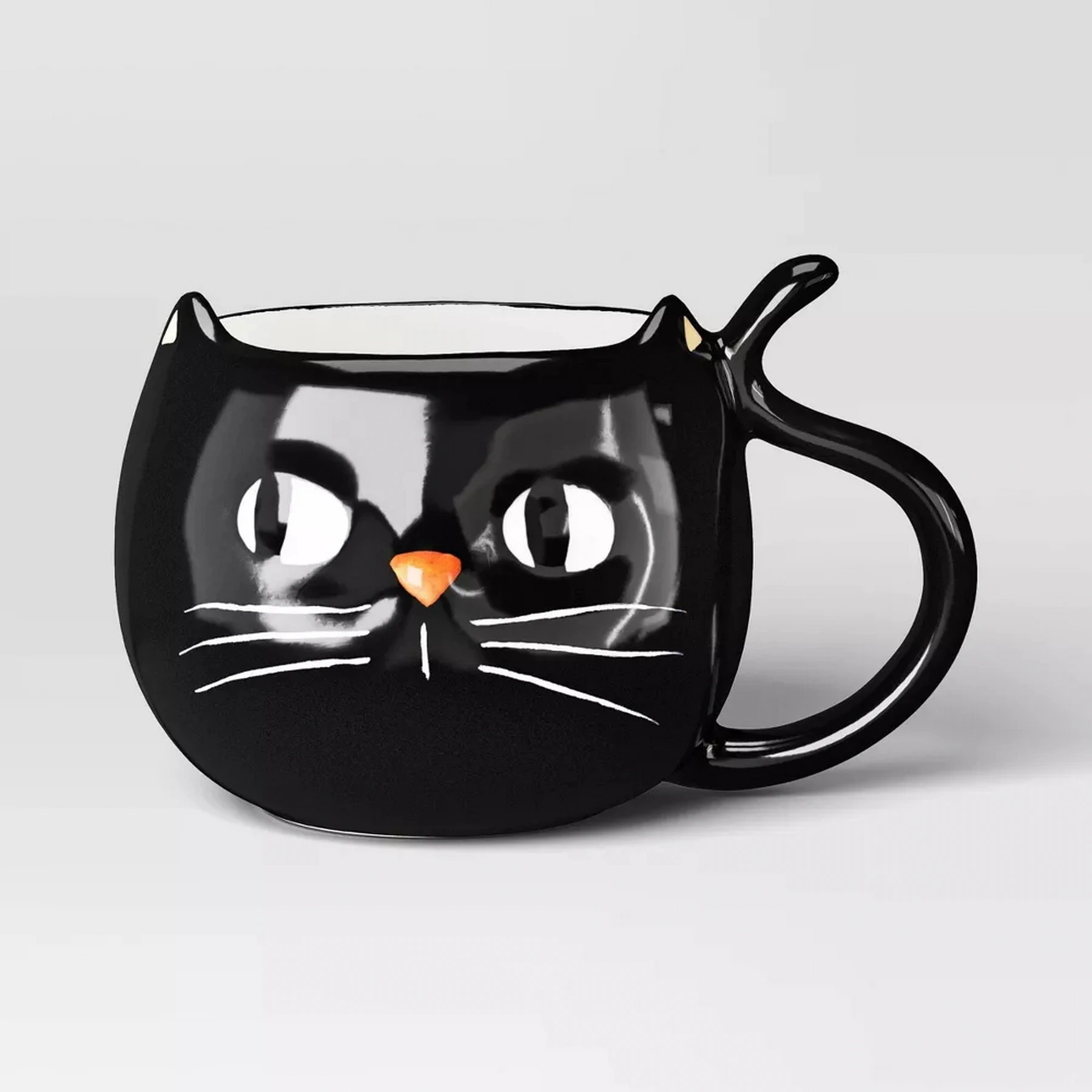 This mug features a black cat’s face with ears and a tail-shaped handle.