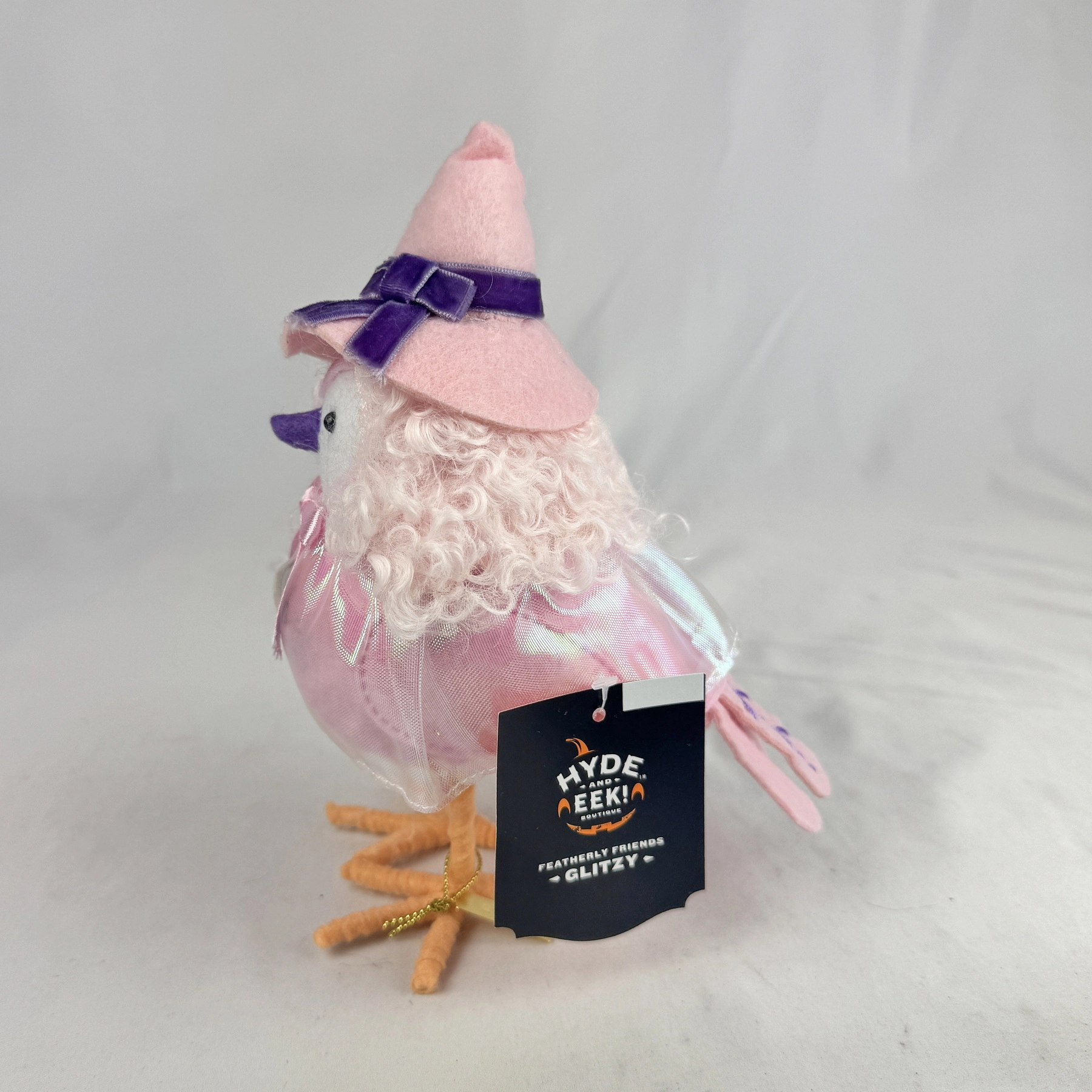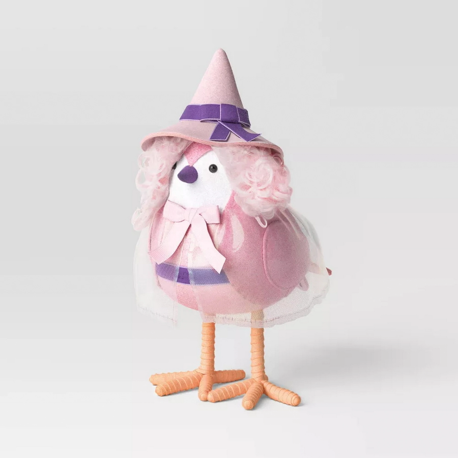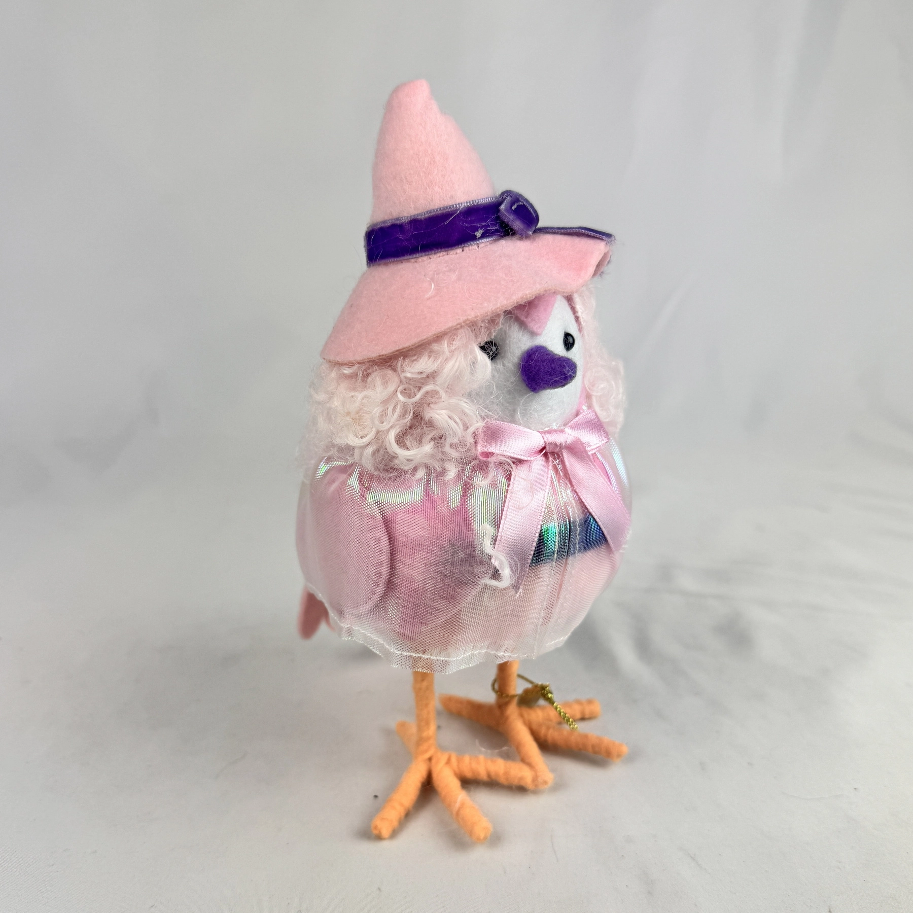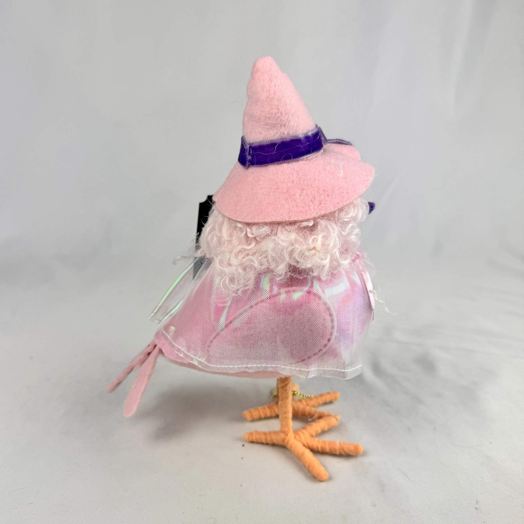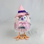 This bird figurine features fuzzy hair and is dressed in a pink mesh cloak along with a witch hat.