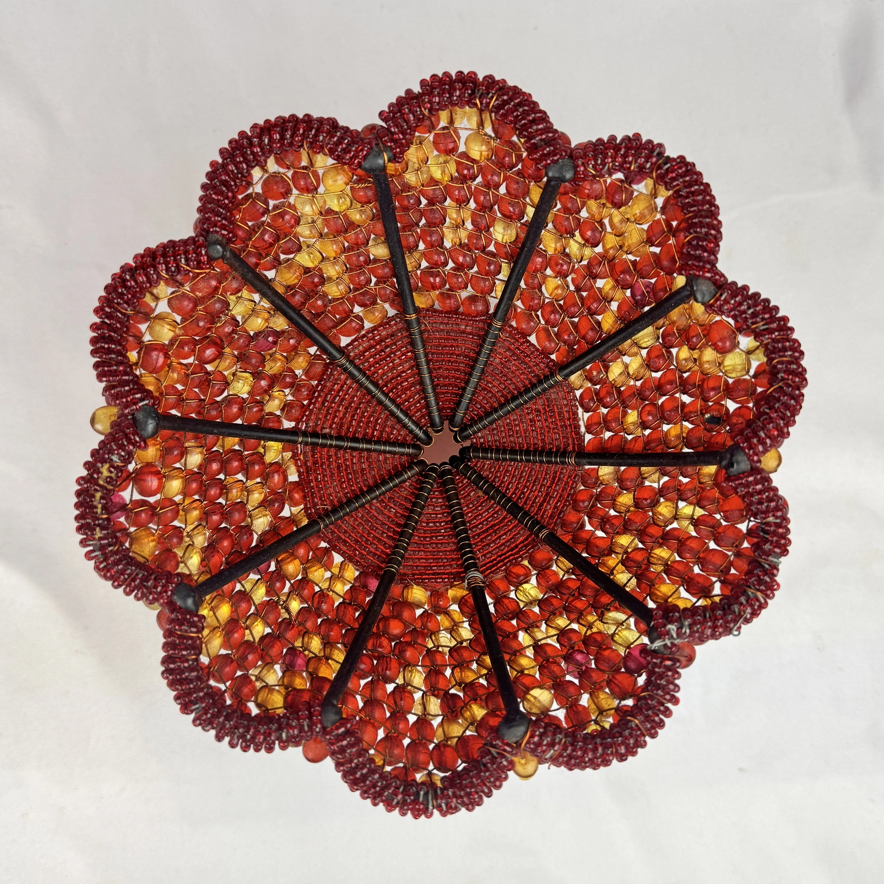 Handcrafted pedestal bowl made from red and amber plastic beads woven on a wire frame. Beautiful scalloped rim and floral spoke design make this a striking boho decorative centerpiece or fruit bowl.
