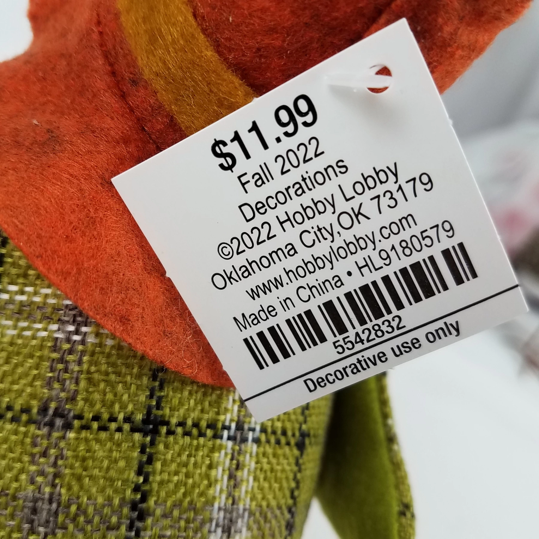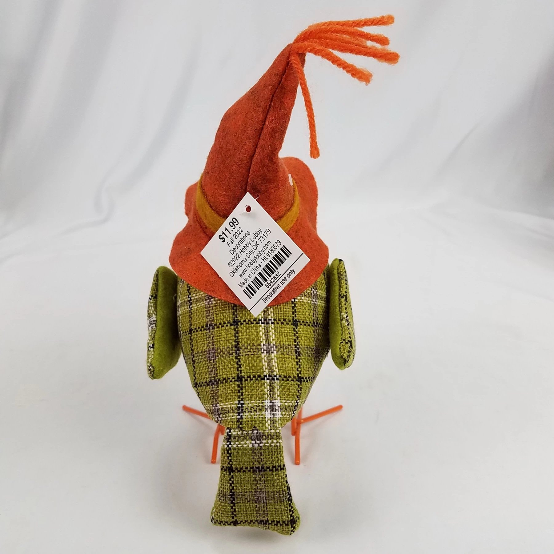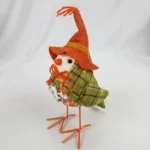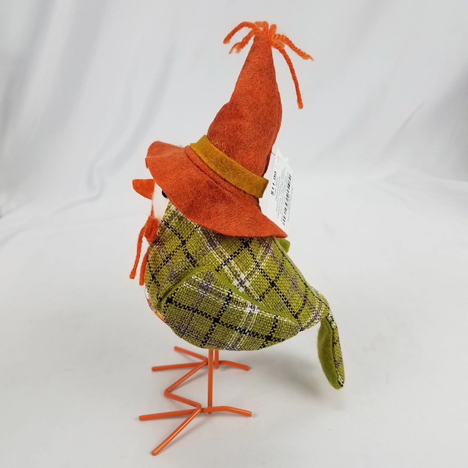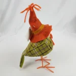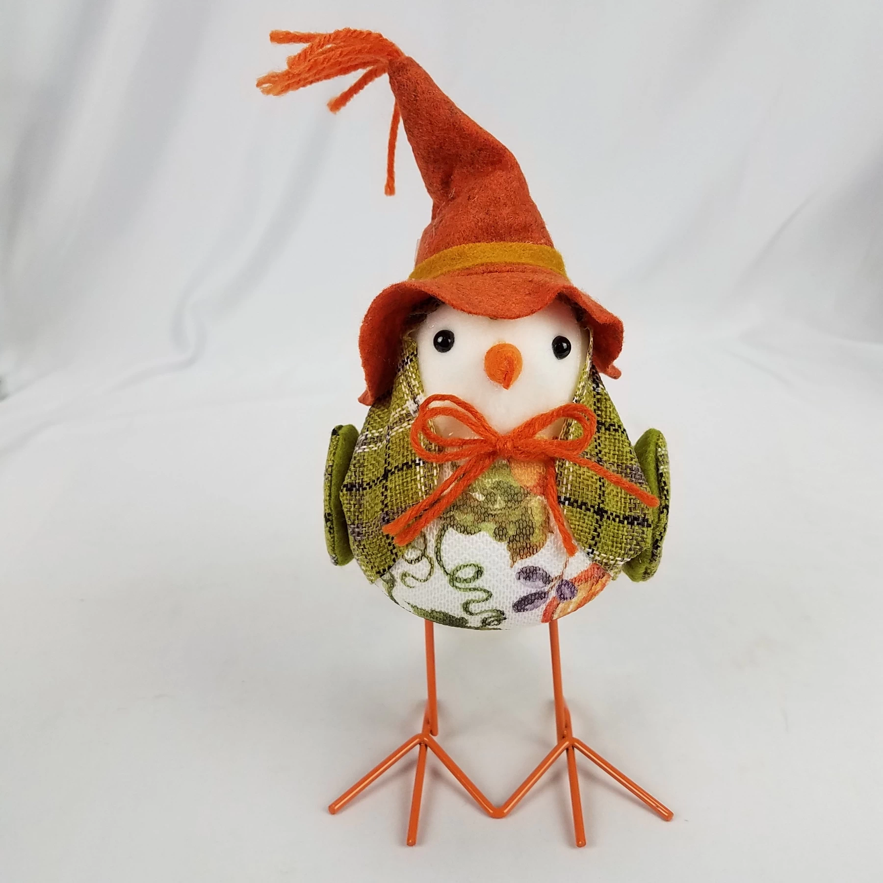 Arrange an eye-catching display with this Green Tweed Bird. This foam bird stands on metal legs and sports a green tweed coat. Its orange scarecrow hat and pumpkin adorned belly add to its cozy style.