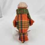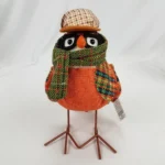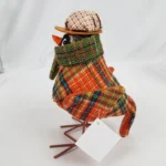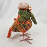 Arrange an eye-catching display with this Orange Tweed Bird. This foam bird stands on metal legs and sports an orange and green tweed coat. Its brown plaid cap, green scarf, and black-rimmed glasses add to its cozy style.