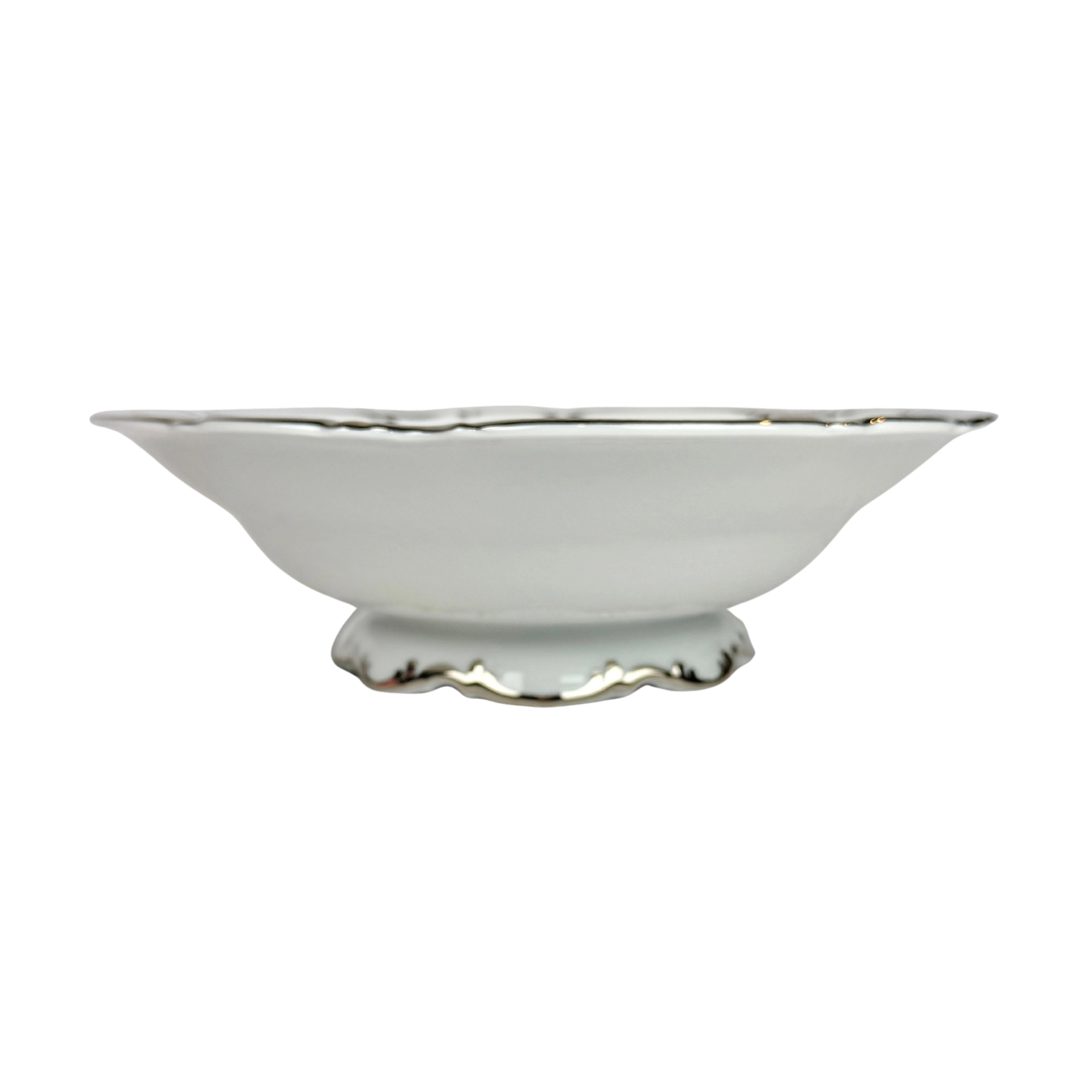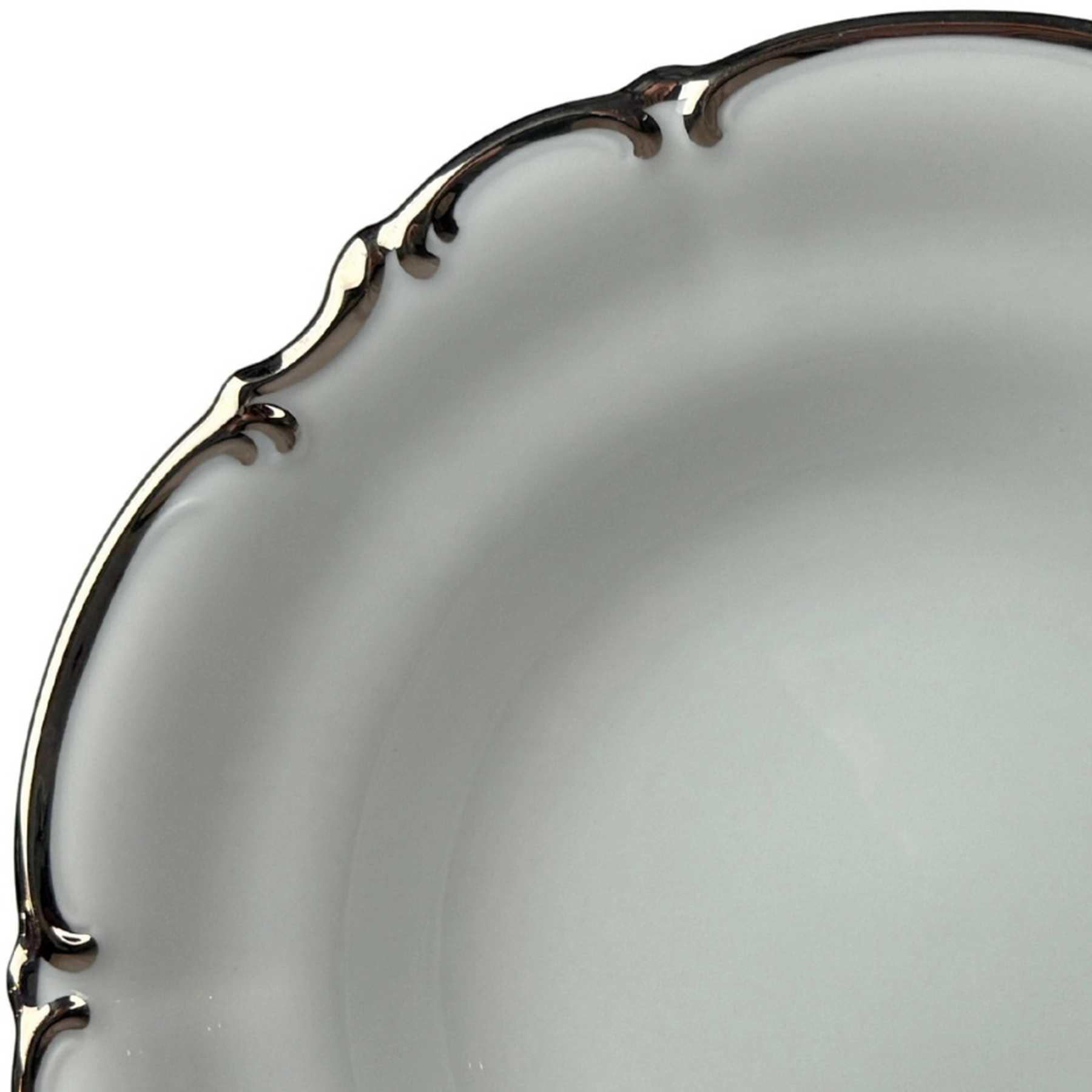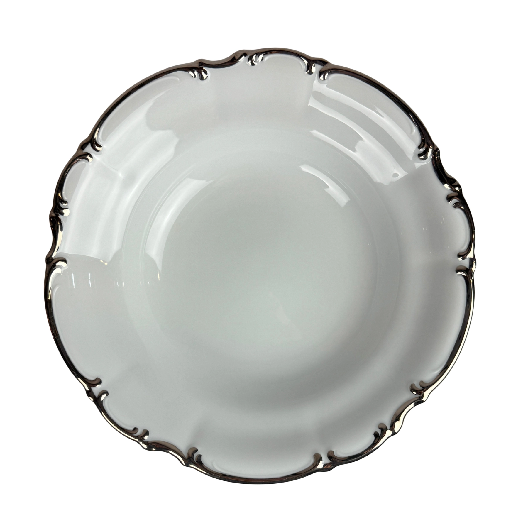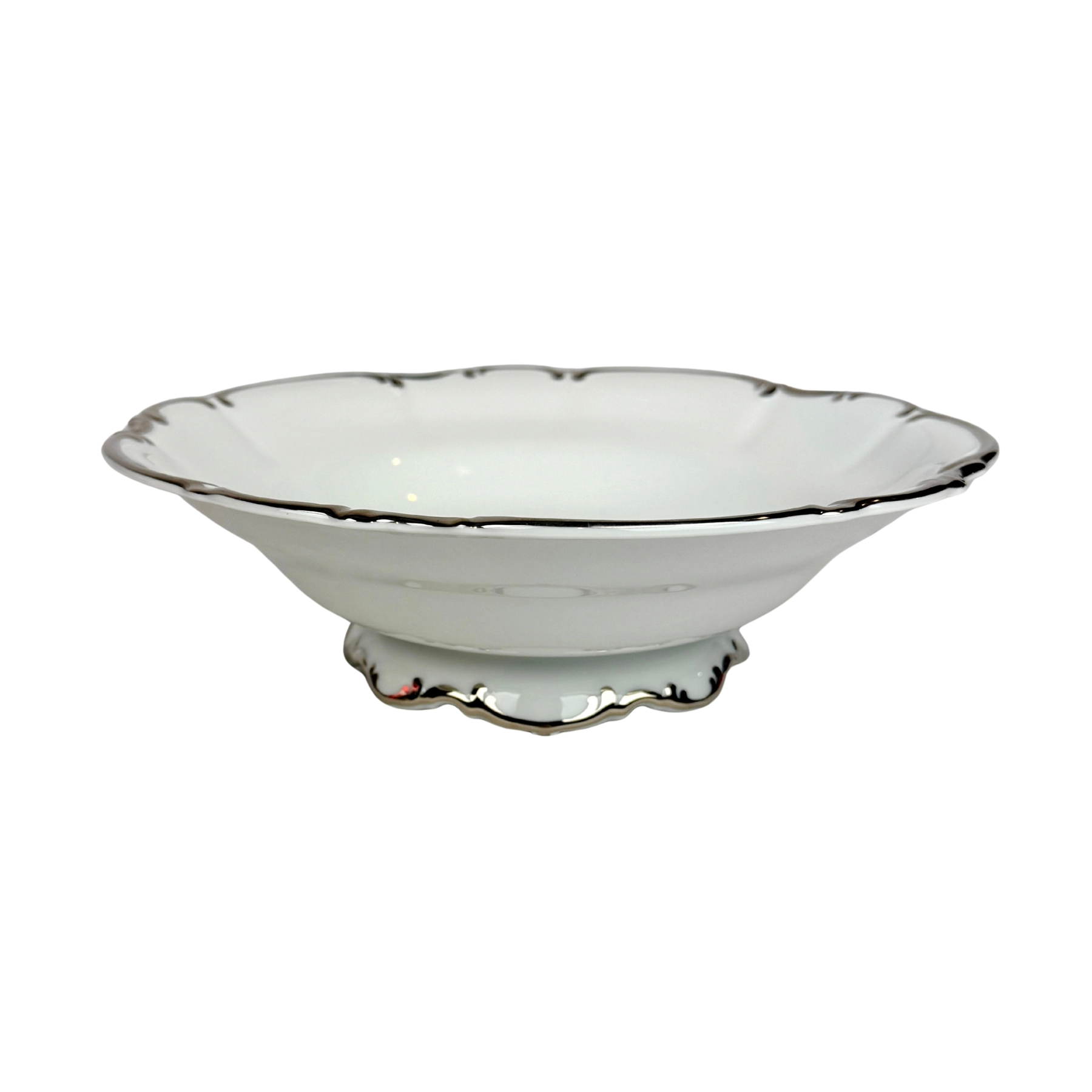 • White, Platinum Trim, Scalloped, Scroll Accents, Footed