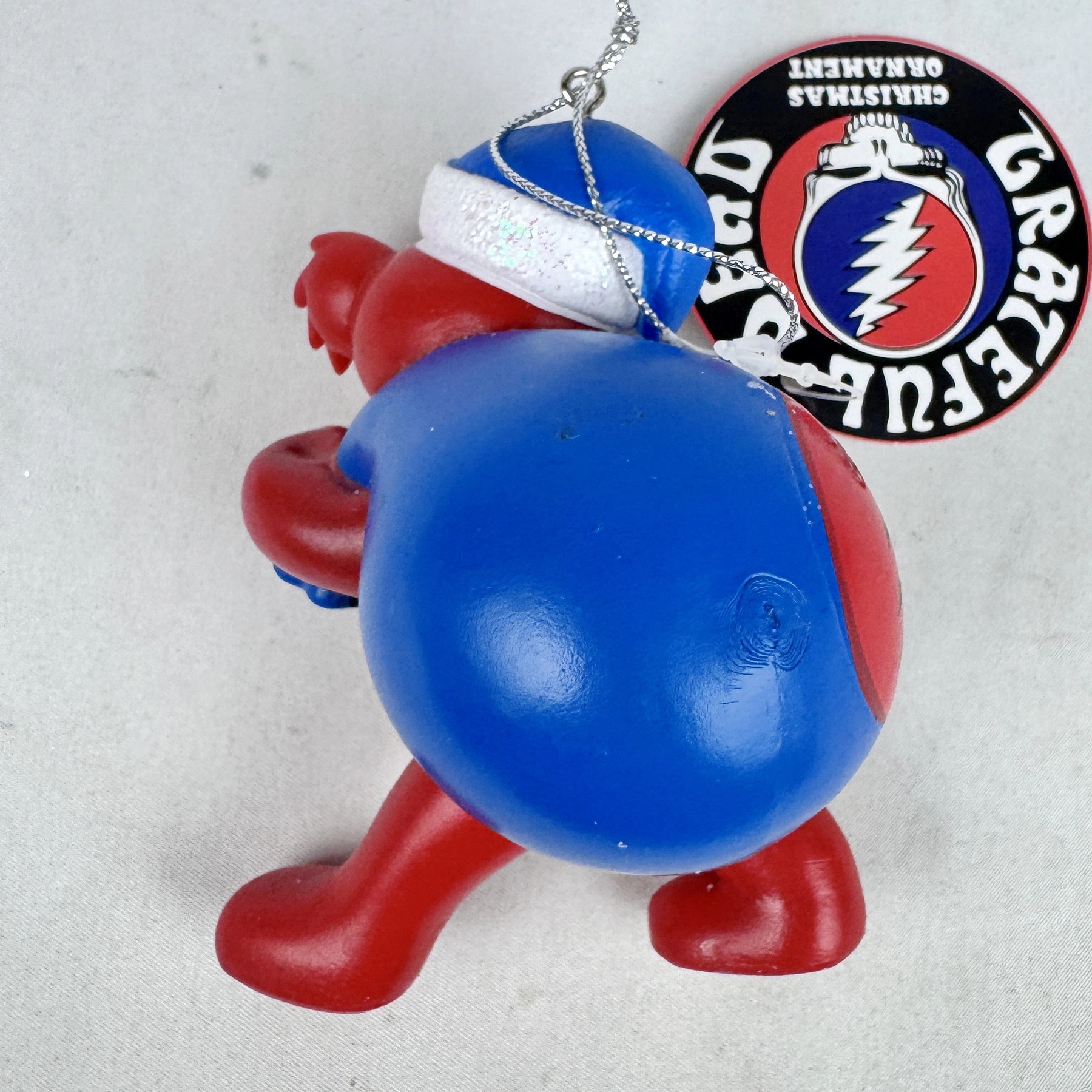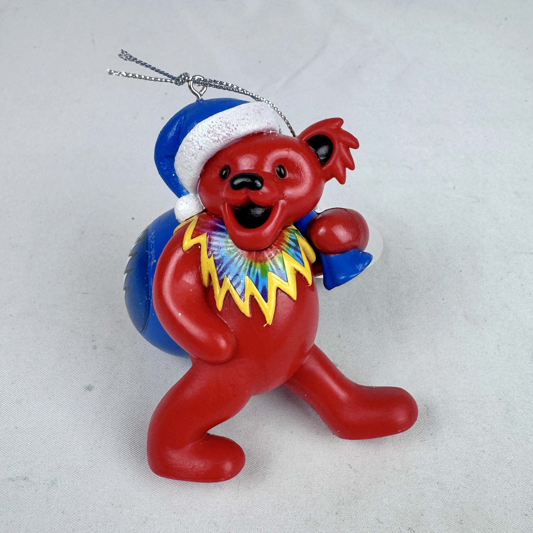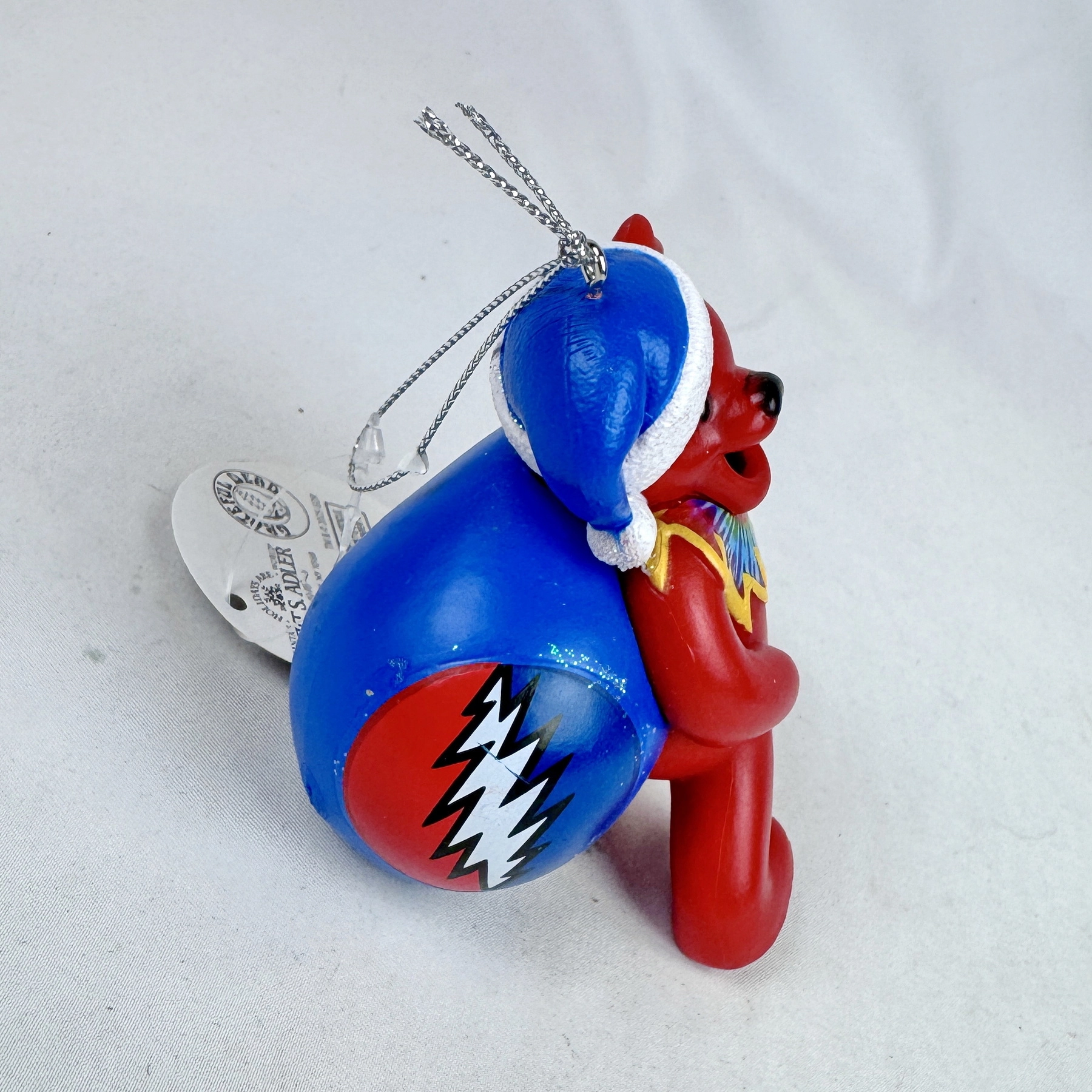 Official Kurt S. Adler Grateful Dead Christmas ornament featuring a red Dancing Bear wearing a Santa hat and carrying a blue sack with the Steal Your Face logo. Bright, detailed design with tie-dye collar and hanging cord attached. New with original tag. Decorative use only – not a toy.