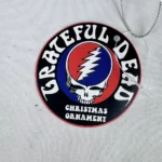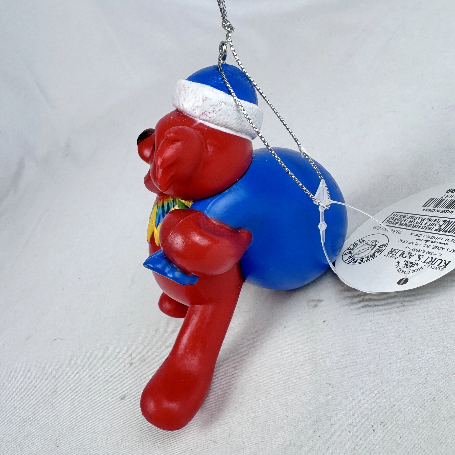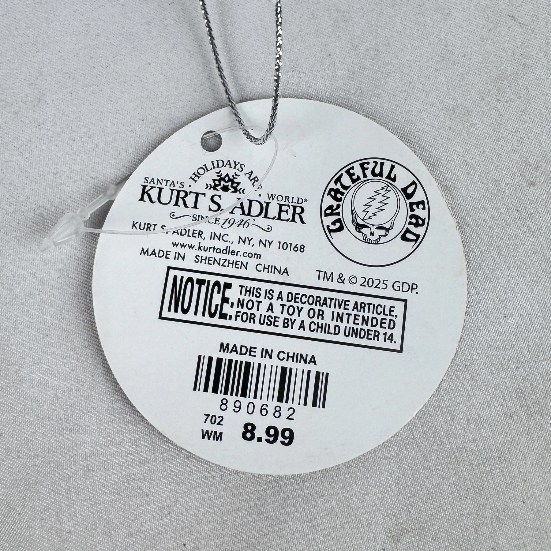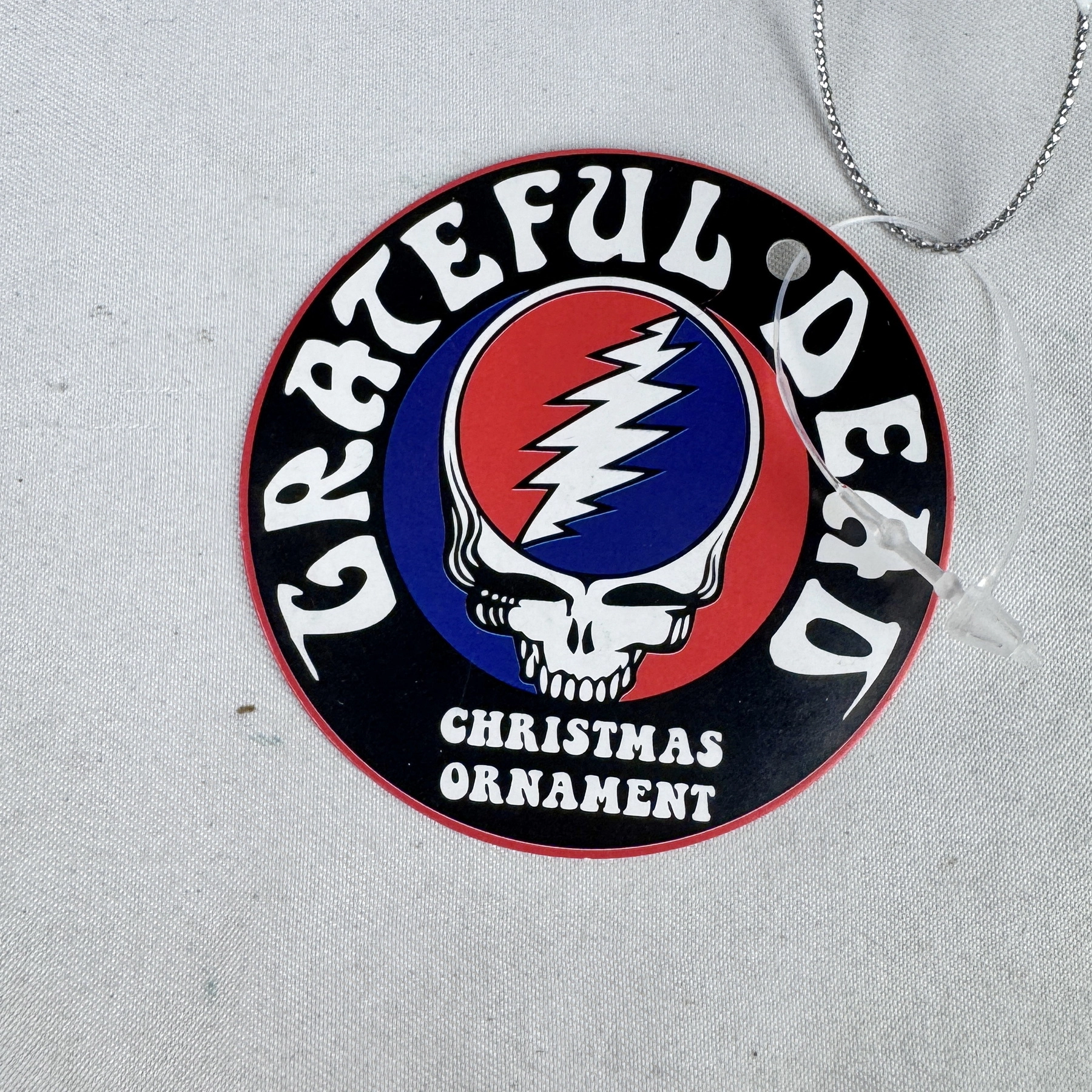 Official Kurt S. Adler Grateful Dead Christmas ornament featuring a red Dancing Bear wearing a Santa hat and carrying a blue sack with the Steal Your Face logo. Bright, detailed design with tie-dye collar and hanging cord attached. New with original tag. Decorative use only – not a toy.