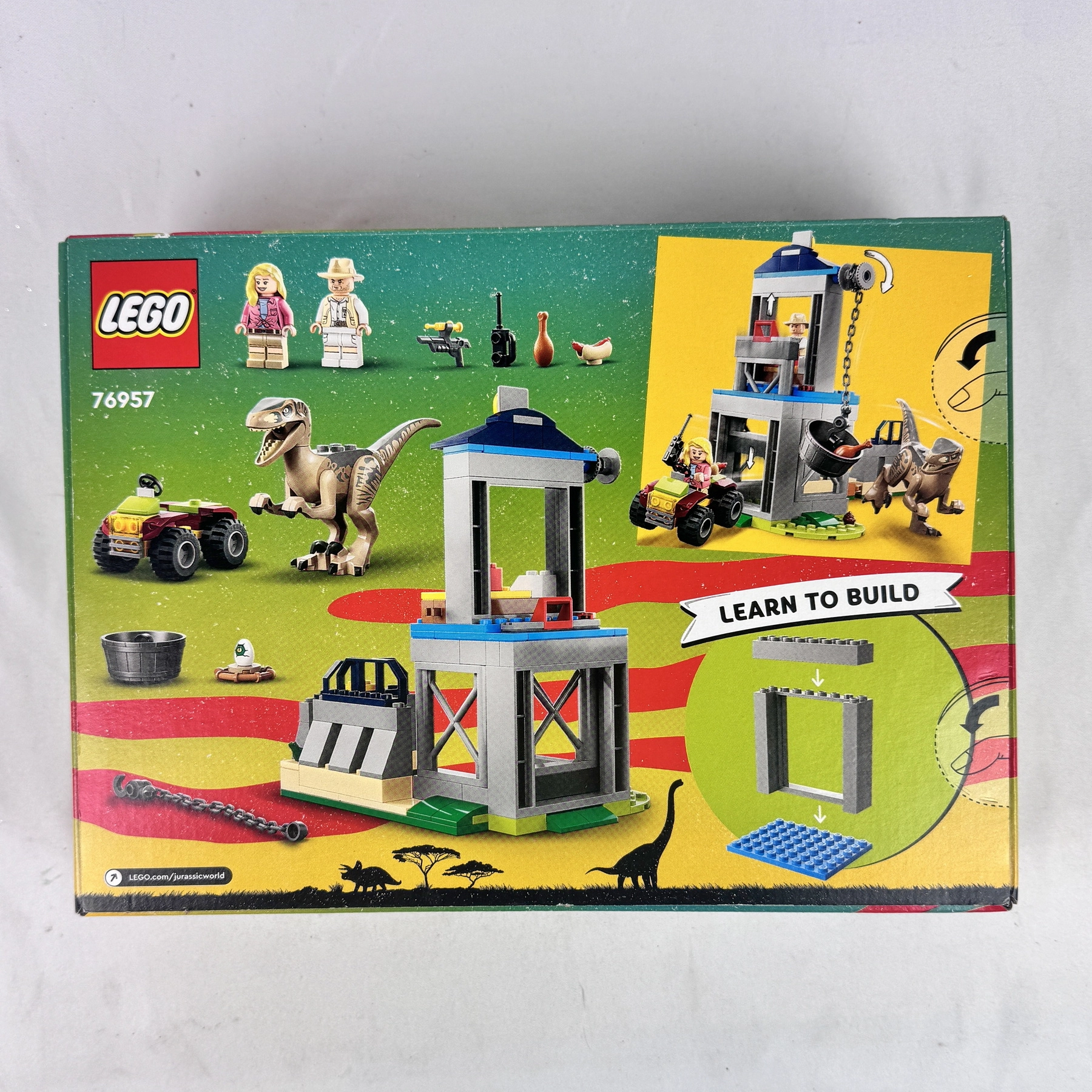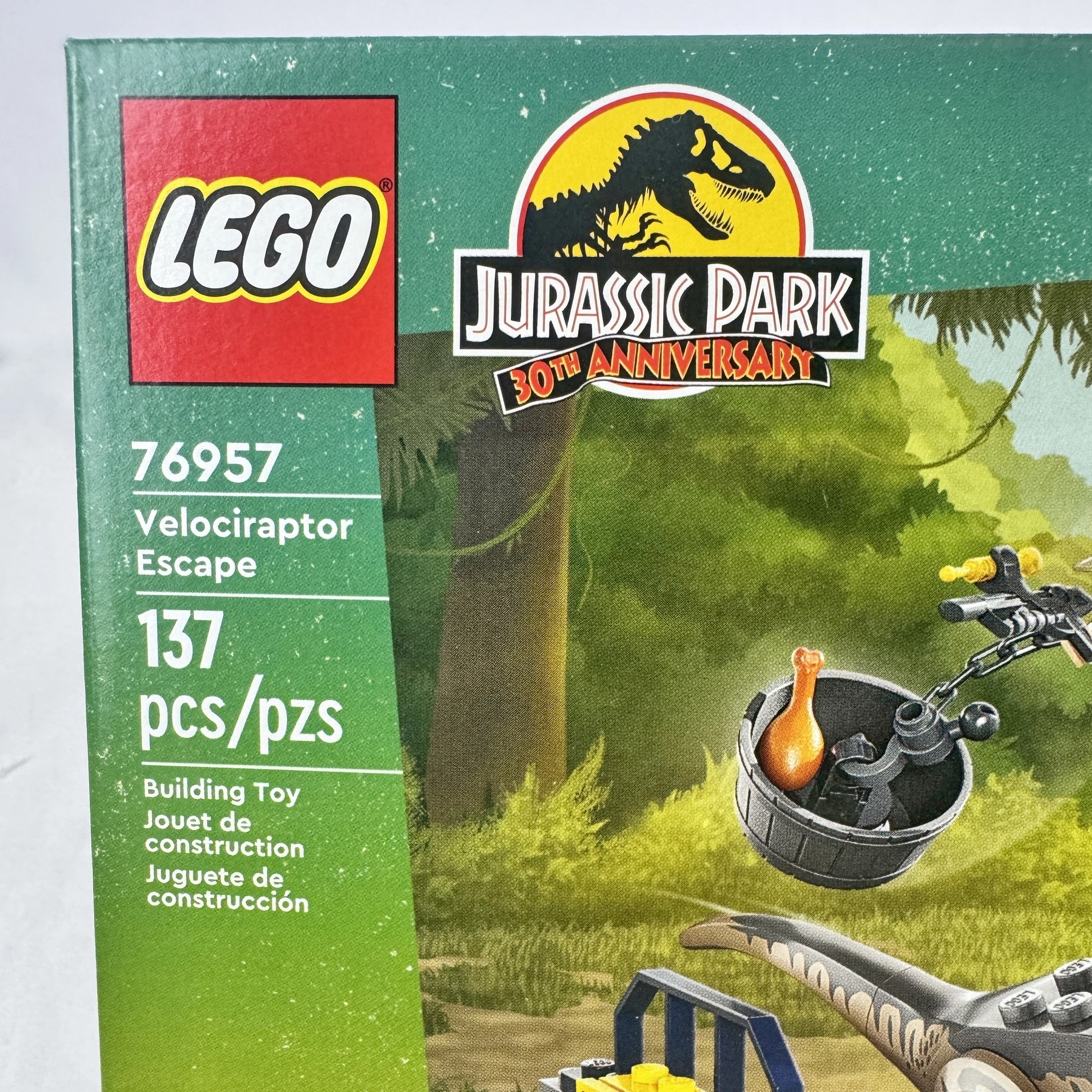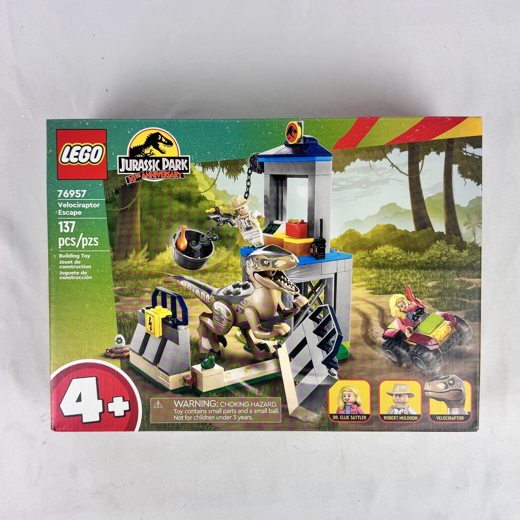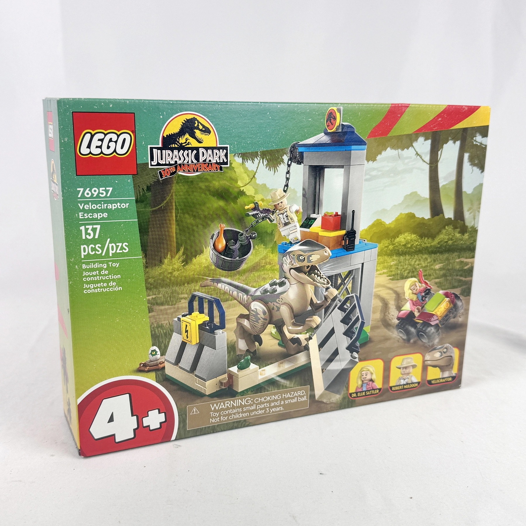 Experience dino-sized action with the LEGO® Jurassic Park Velociraptor Escape (76957) set. Featuring 137 pieces, this 30th Anniversary edition includes a buildable guard tower, ATV vehicle, Velociraptor figure, and Dr. Ellie Sattler and Robert Muldoon minifigures. Designed for ages 4+, it’s a fun and easy-to-build adventure set for young Jurassic Park fans.