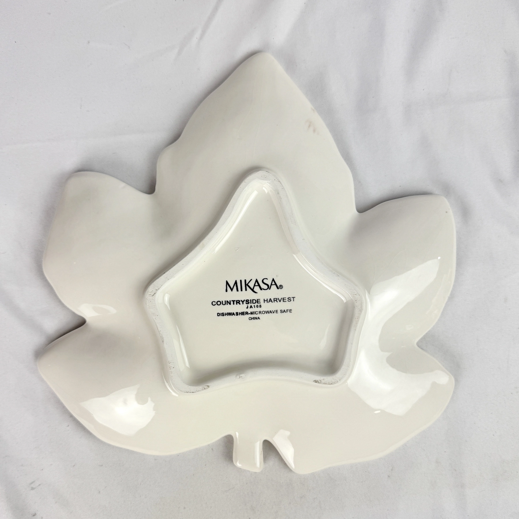 Add rustic charm to your table with this Mikasa Countryside Harvest leaf dish. The white ceramic maple leaf design features brown accents for a vintage touch. Perfect for serving appetizers, candy, or seasonal decor. Dishwasher and microwave safe.