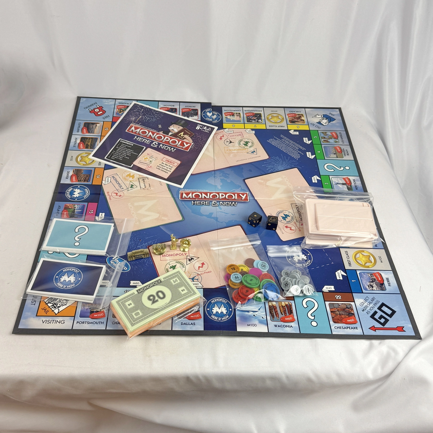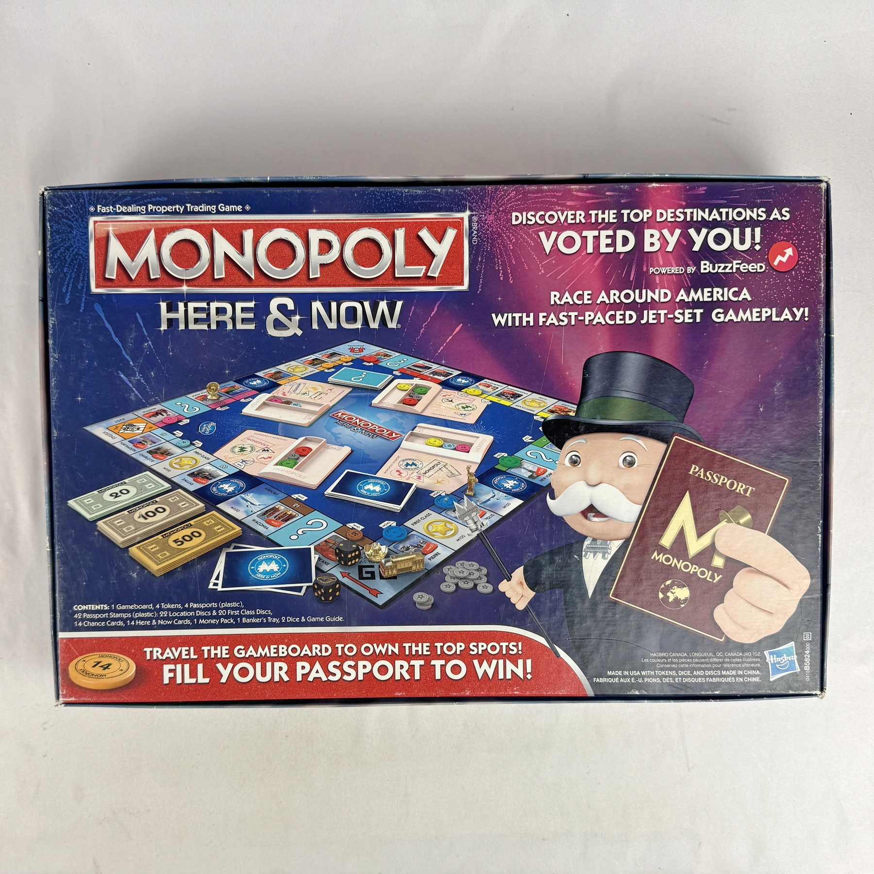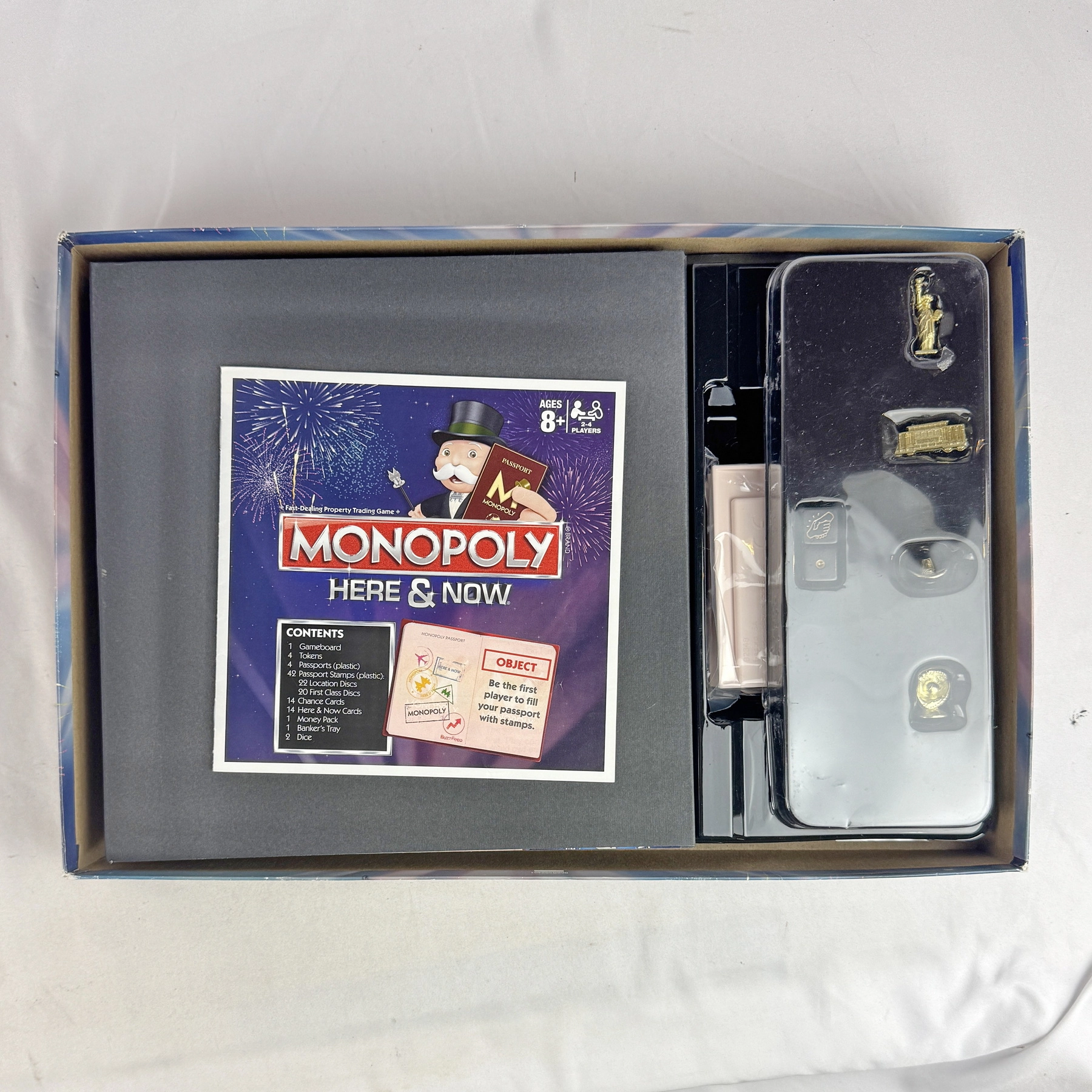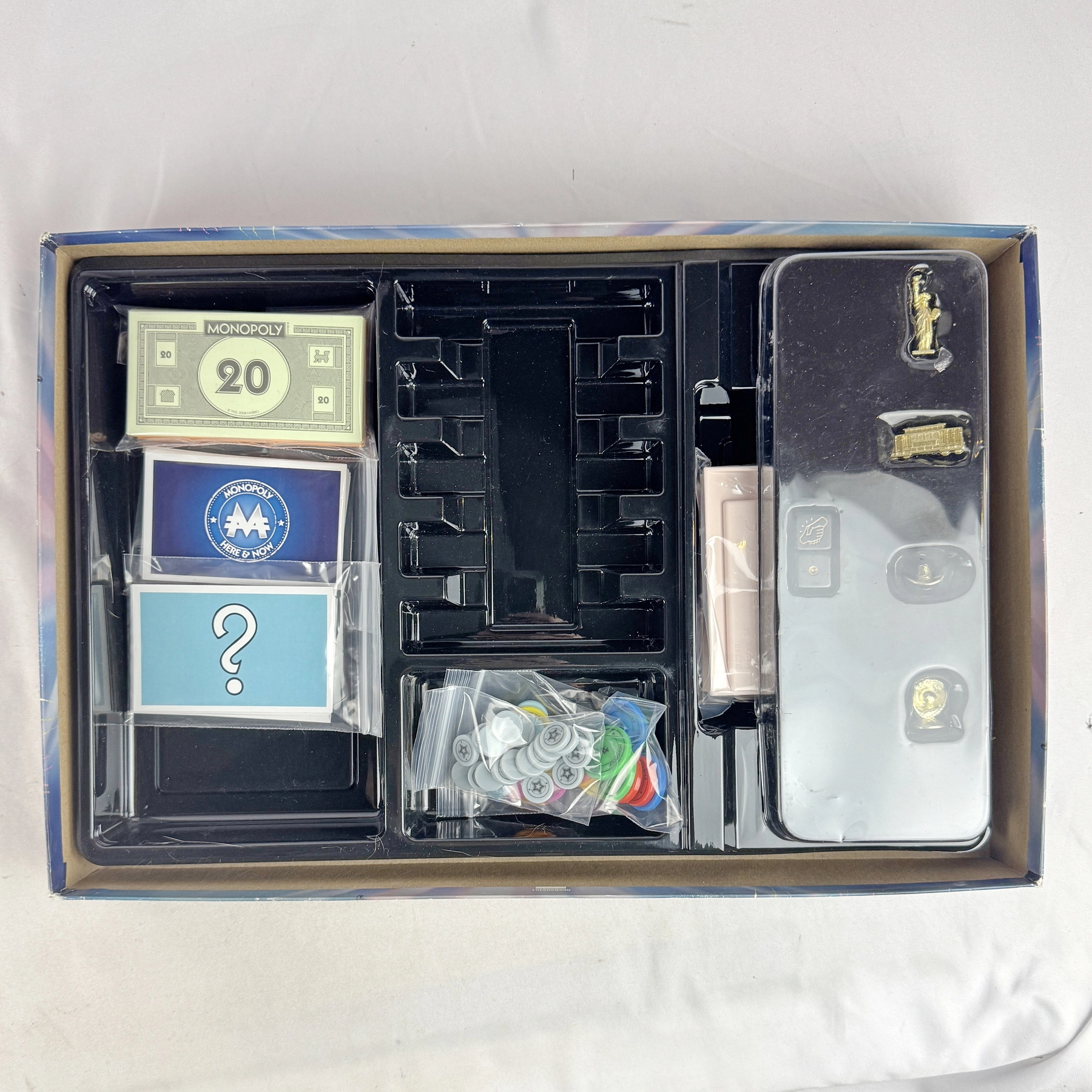 Complete Monopoly HERE & NOW Edition (2015). All components included. Box shows edge/corner wear; game contents in very good condition and ready to play.