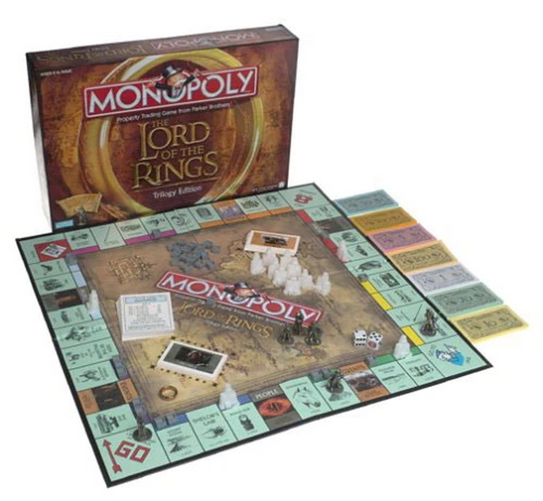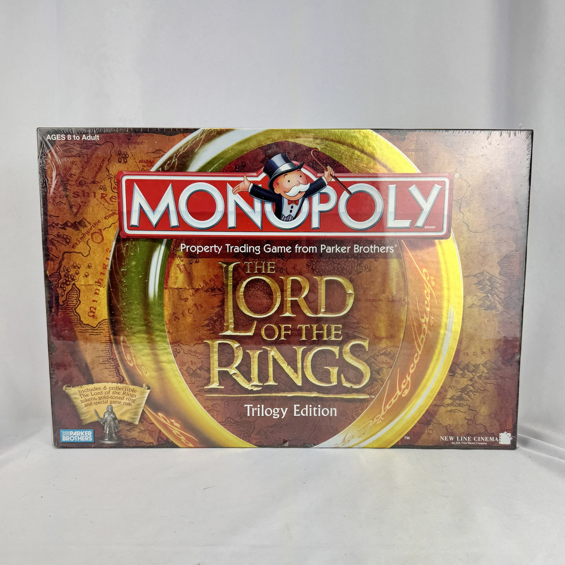 Factory sealed 2003 Monopoly Lord of the Rings Trilogy Edition by Parker Brothers. Features Middle-earth themed gameplay with collectible character tokens. Box shows minor shelf wear under original shrink wrap. Great collectible or gift for LOTR fans.