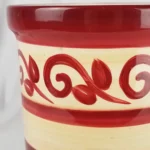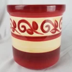 • Hand Painted Utensil crock. Red floral on tan. Red