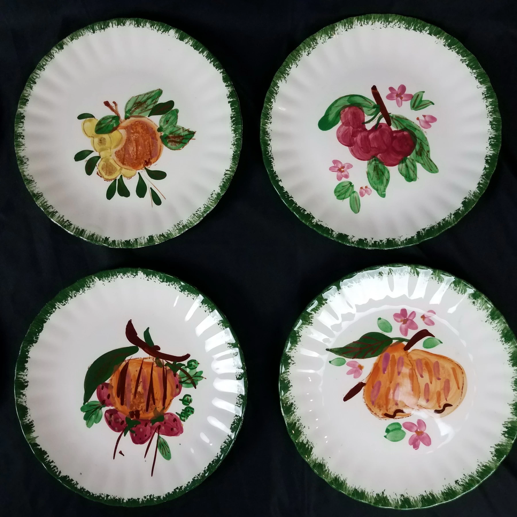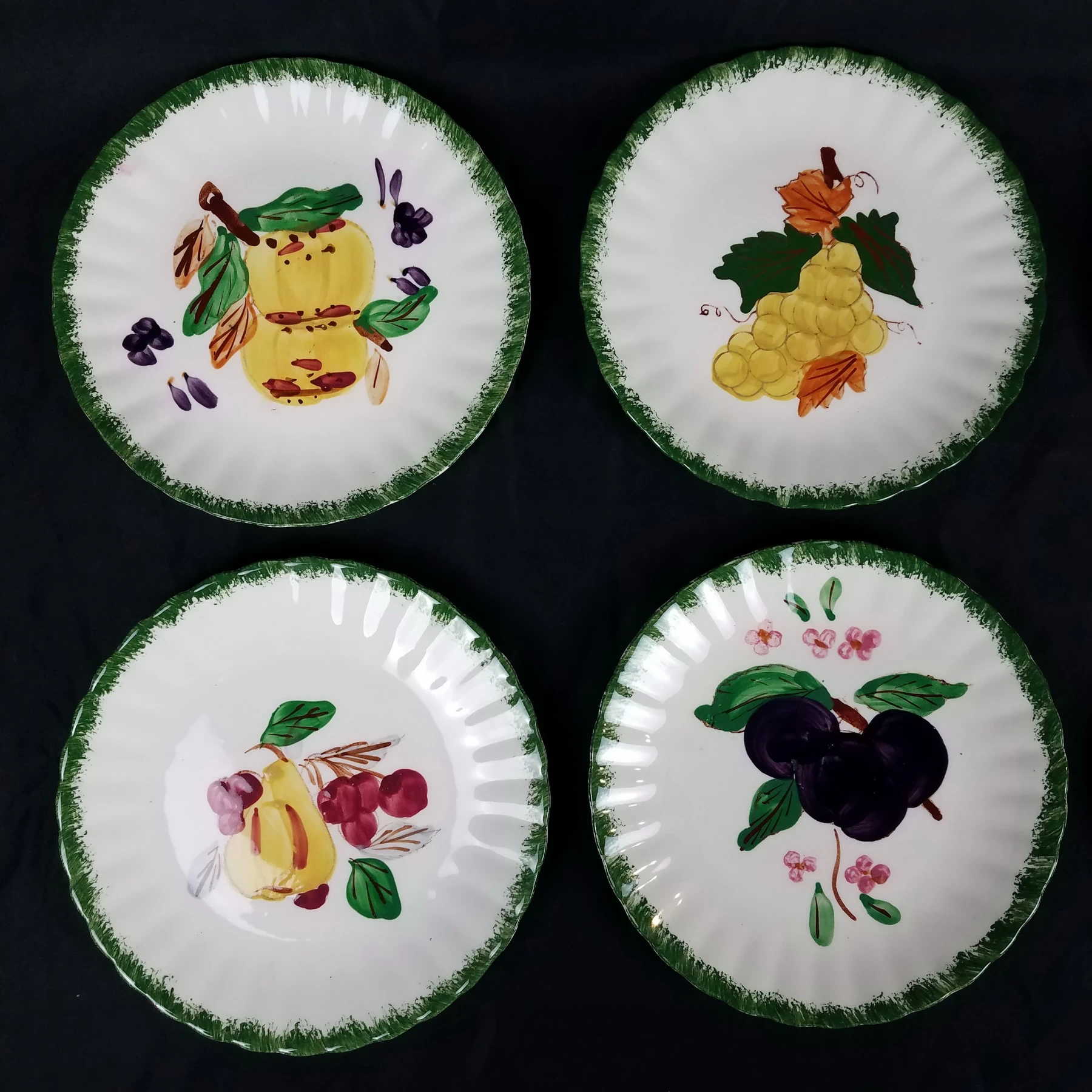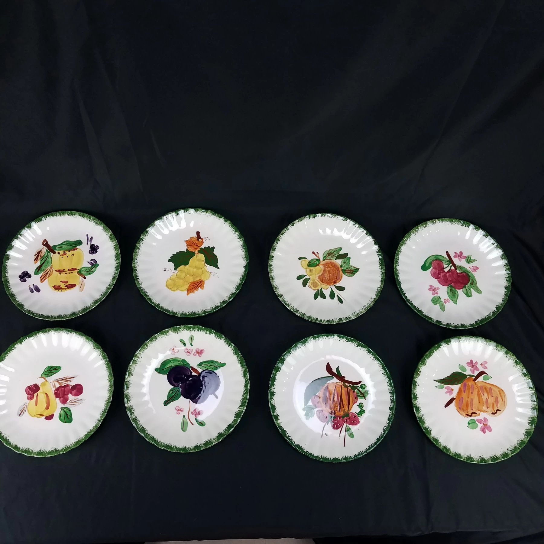Salad Plates, Blue Ridge Southern Pottery, County Fair – Green, Set of 8, Various Fruits, Colonial Style, Hand Painted, Discontinued.