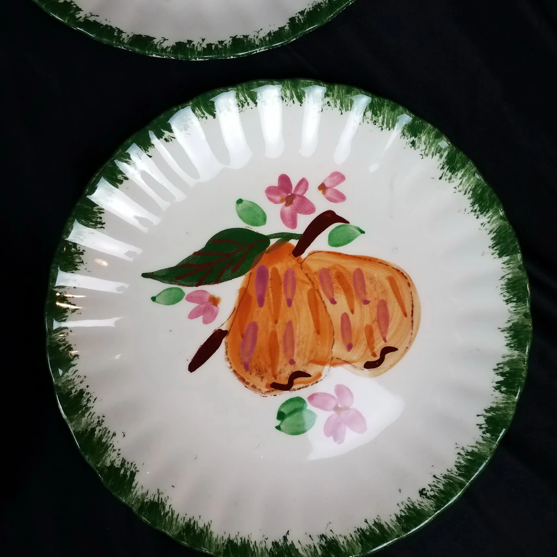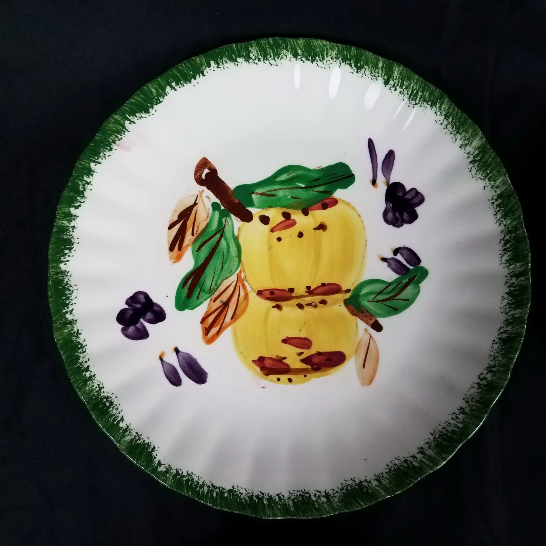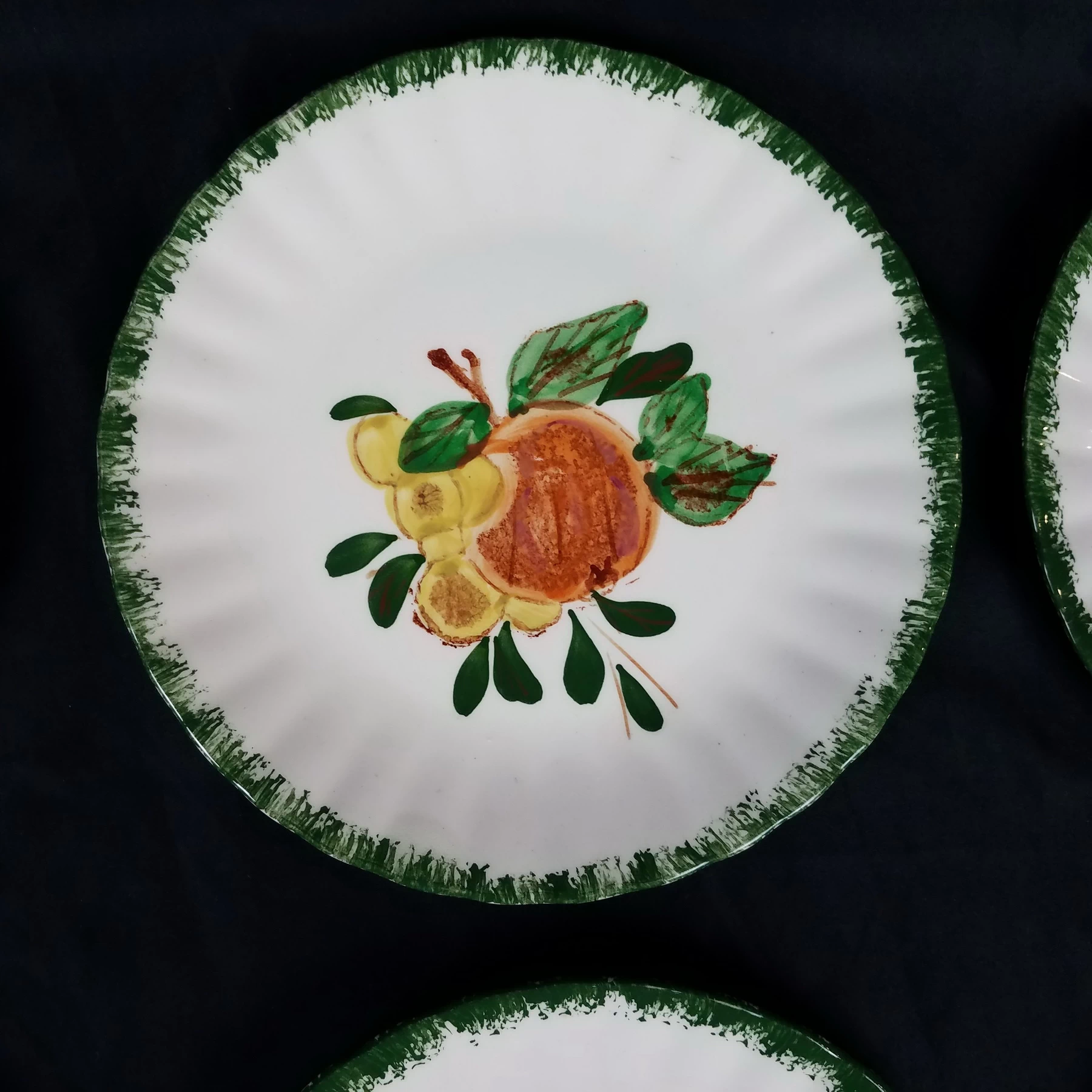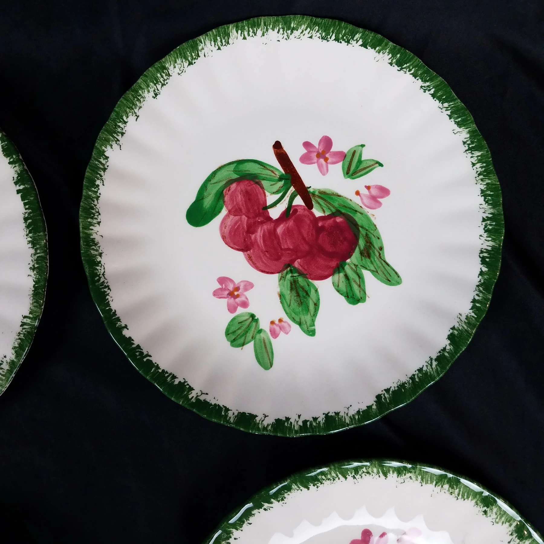 Salad Plates, Blue Ridge Southern Pottery, County Fair – Green, Set of 8, Various Fruits, Colonial Style, Hand Painted, Discontinued.