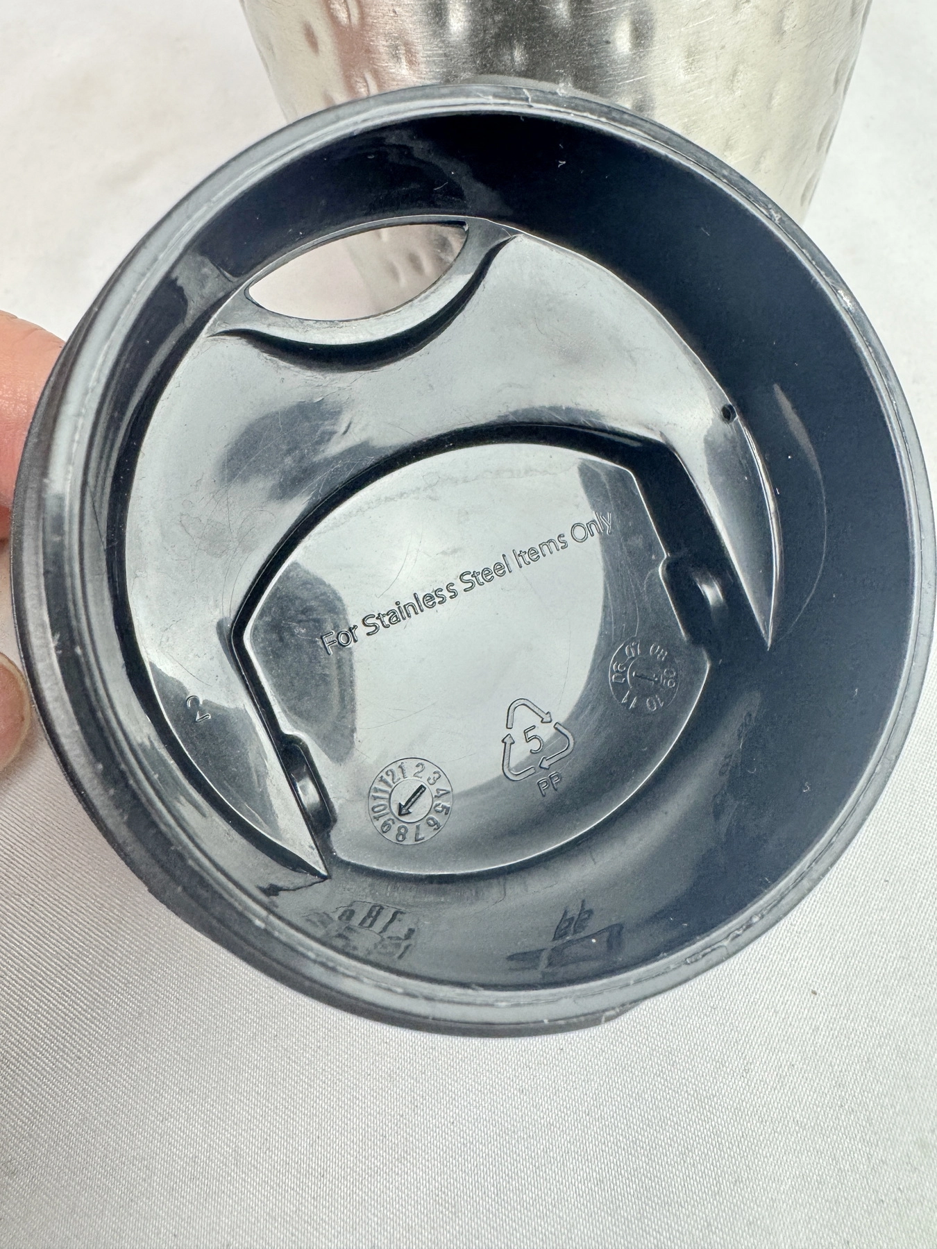 - Tumbler with light cosmetic wear from normal use. No dents, lid functions properly.