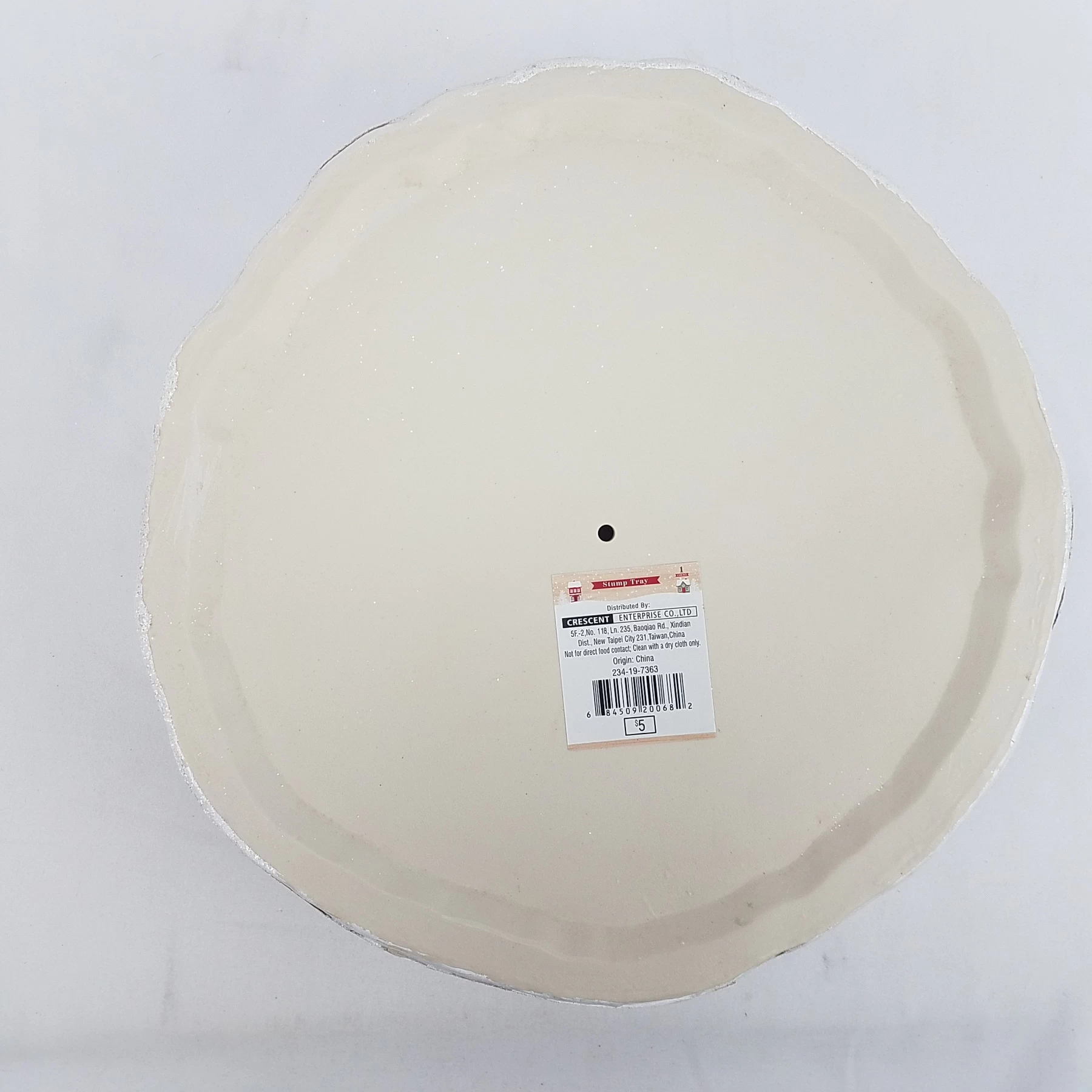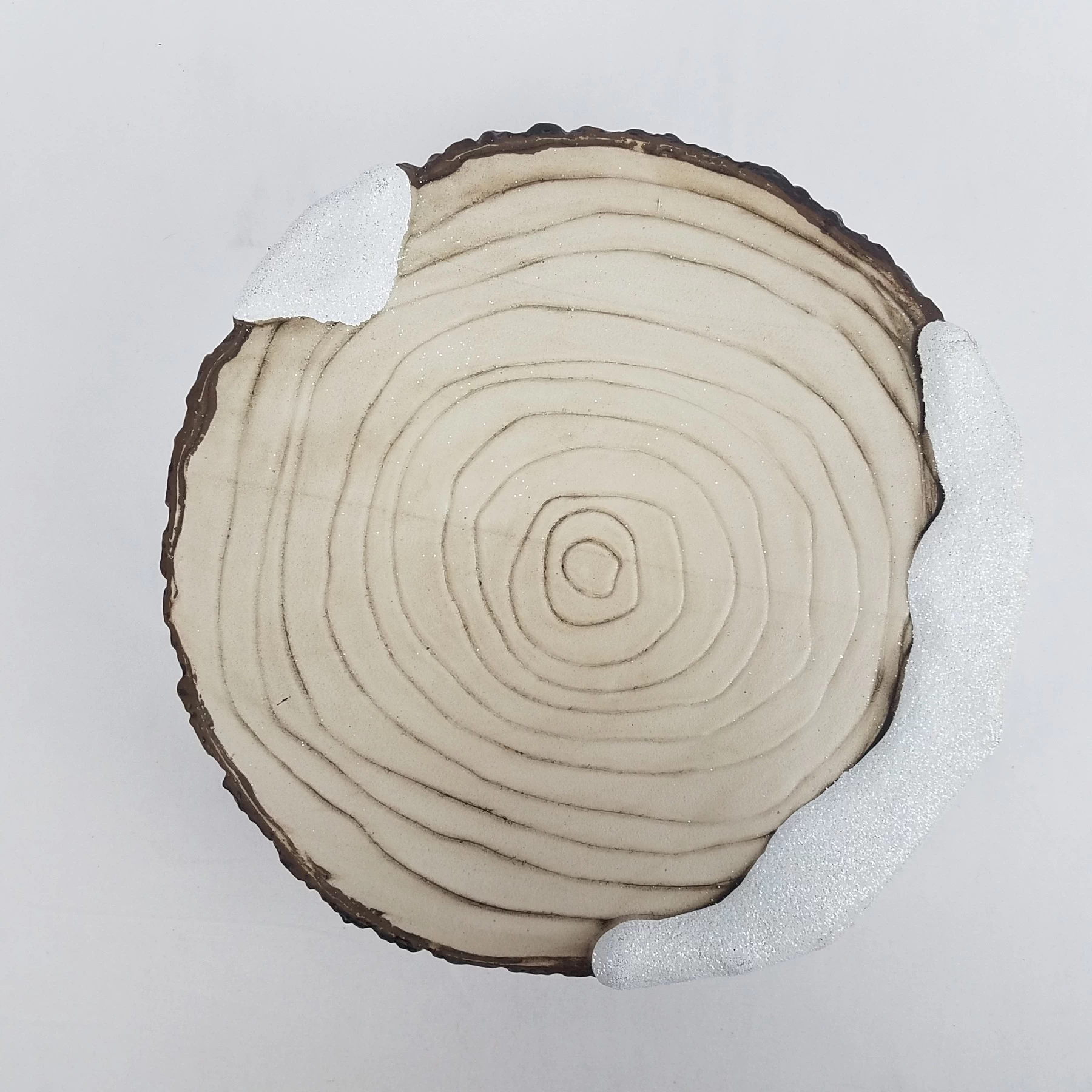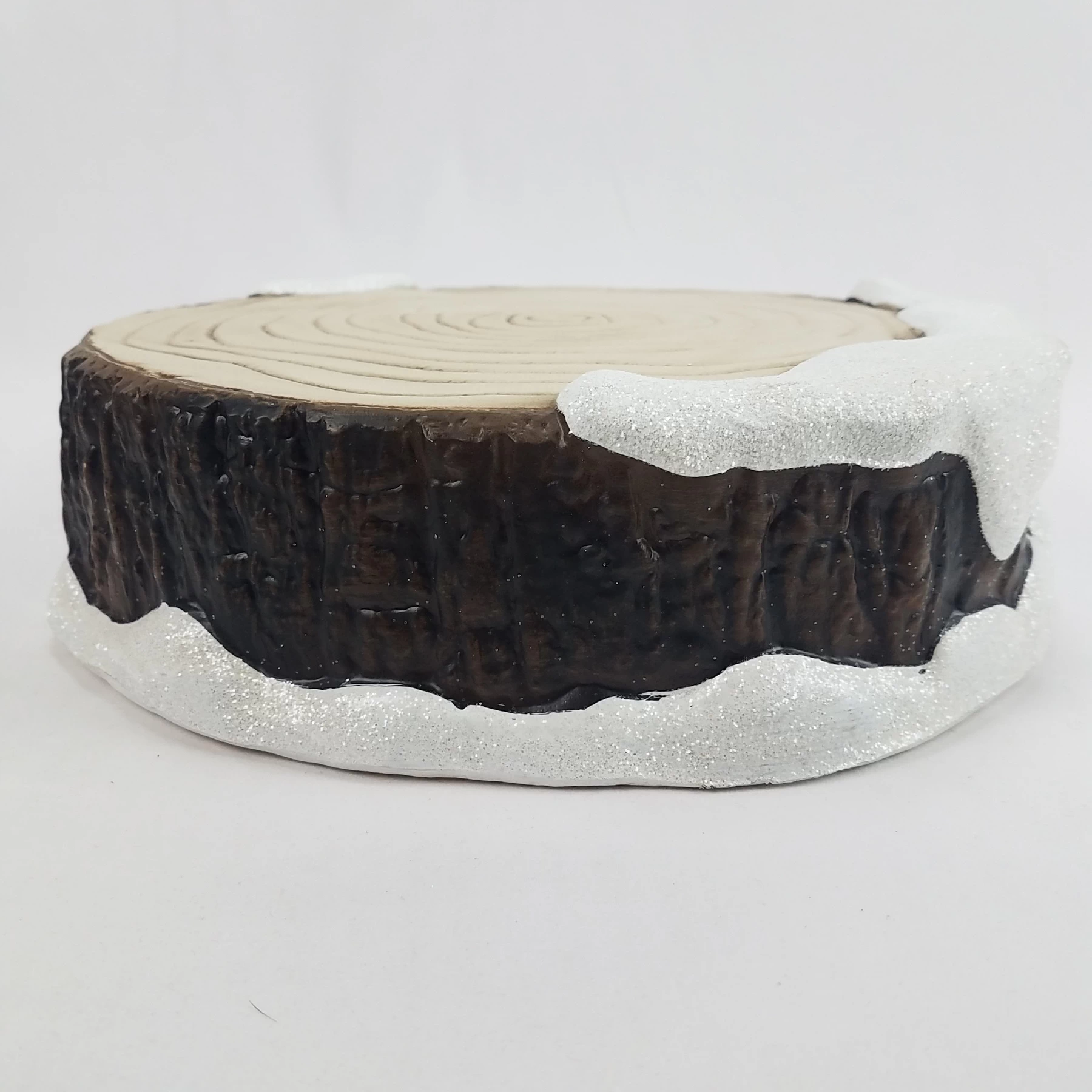 - Plastic tray in form of snow covered tree stump. Perfect to display your Christmas decor