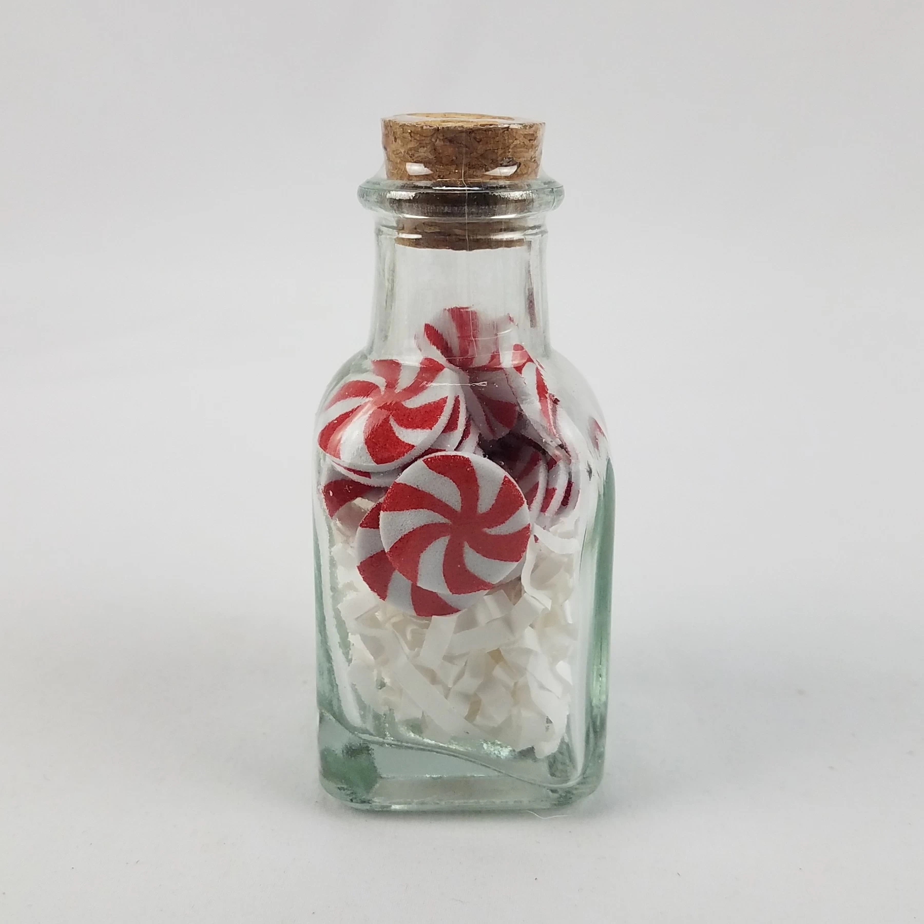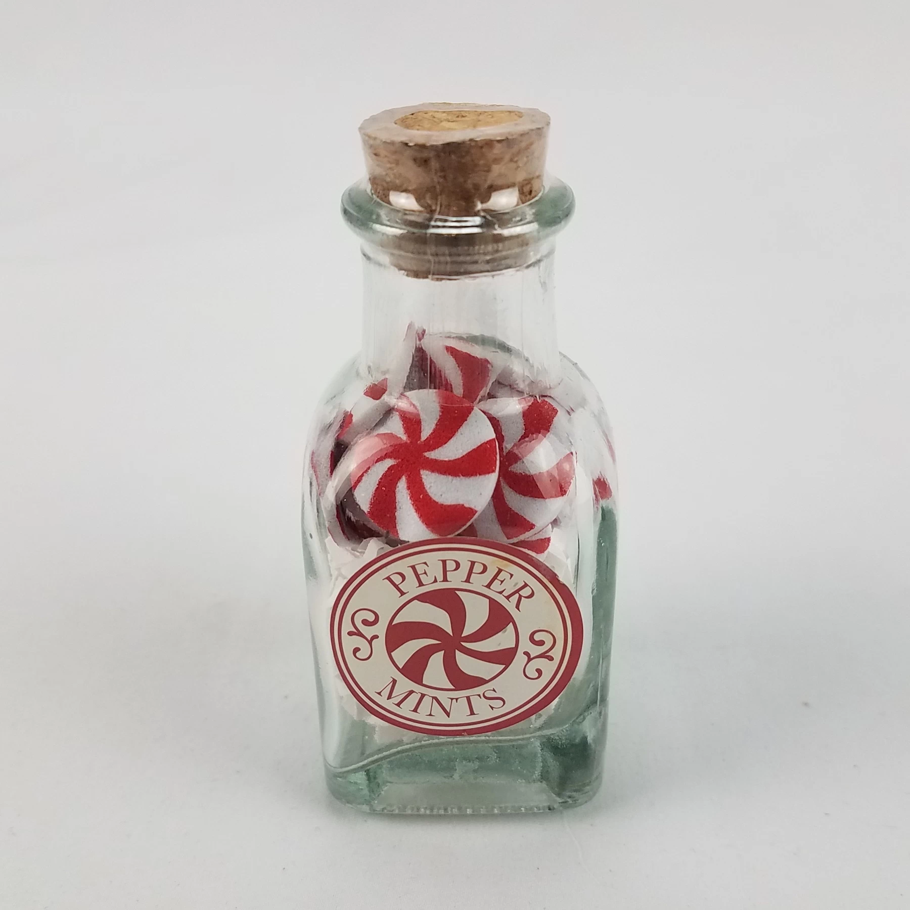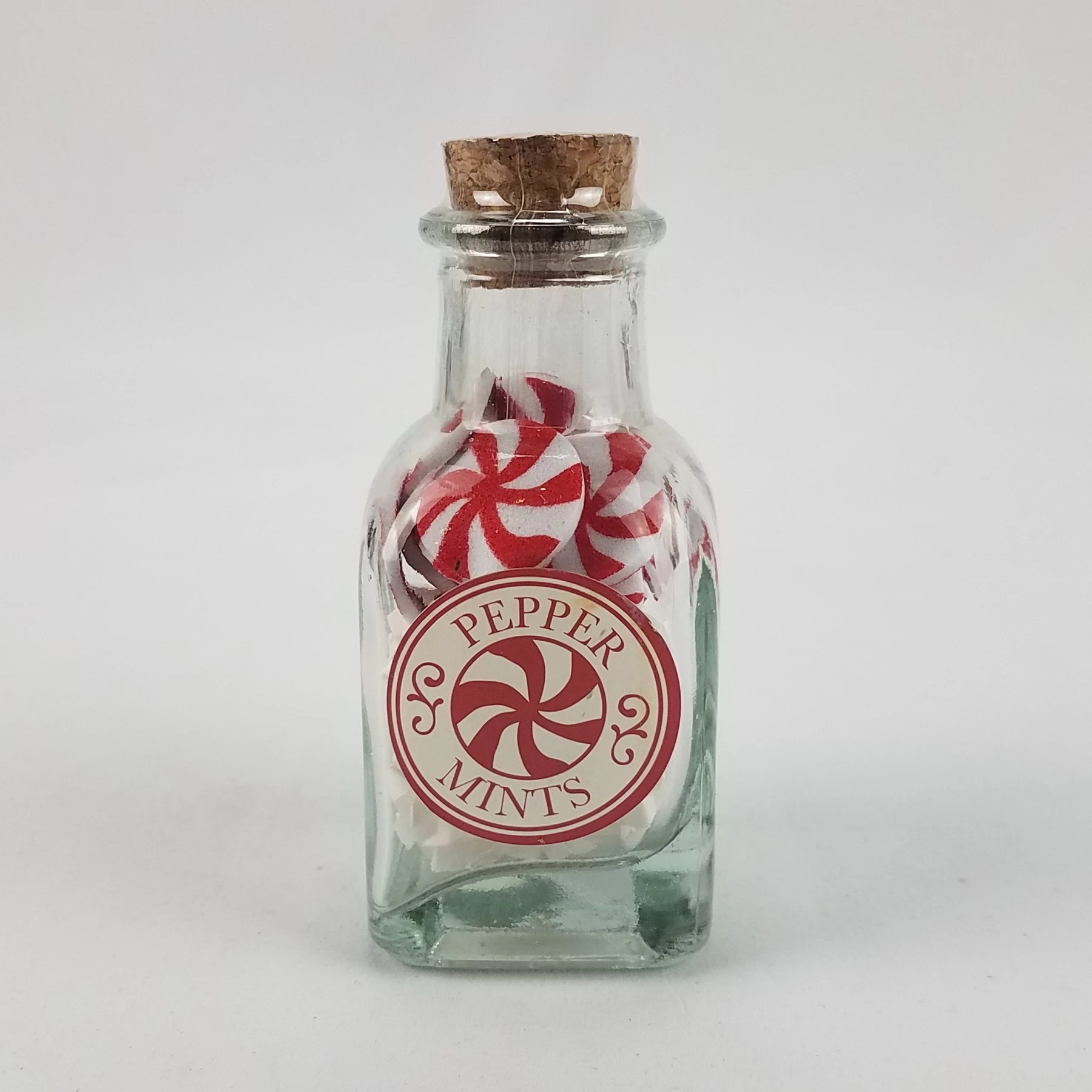 - 1 count glass bottle with contents of 25, small plastic pepper mints and shredded paper