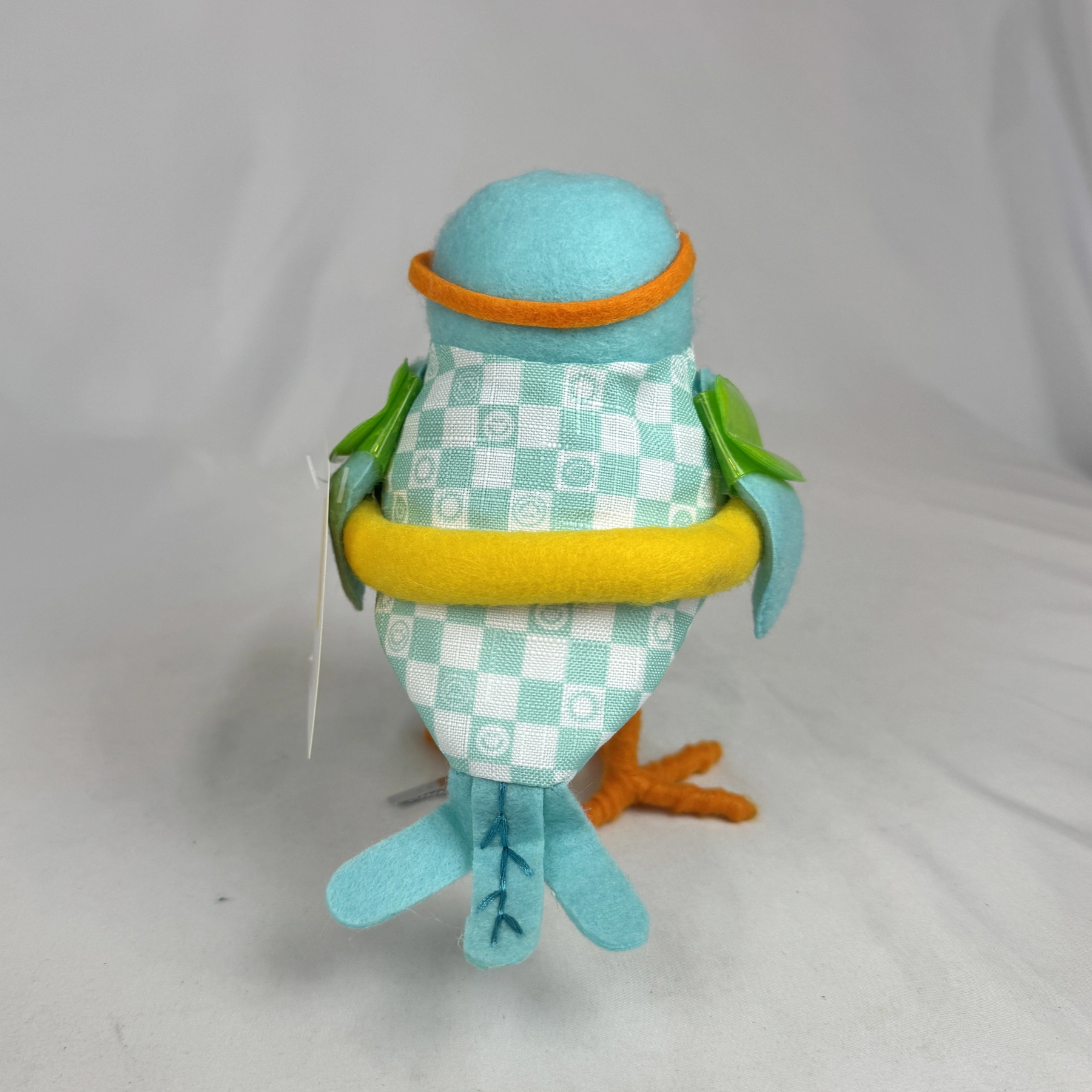 Cute Target Sun Squad “Featherly Friends” bird named Junior dressed for summer fun! Blue fabric bird with orange glasses, green wings, and yellow swim float with attached duck. Tag reads “Indoor decorative use only. Not a toy.” Great for spring/summer decor.