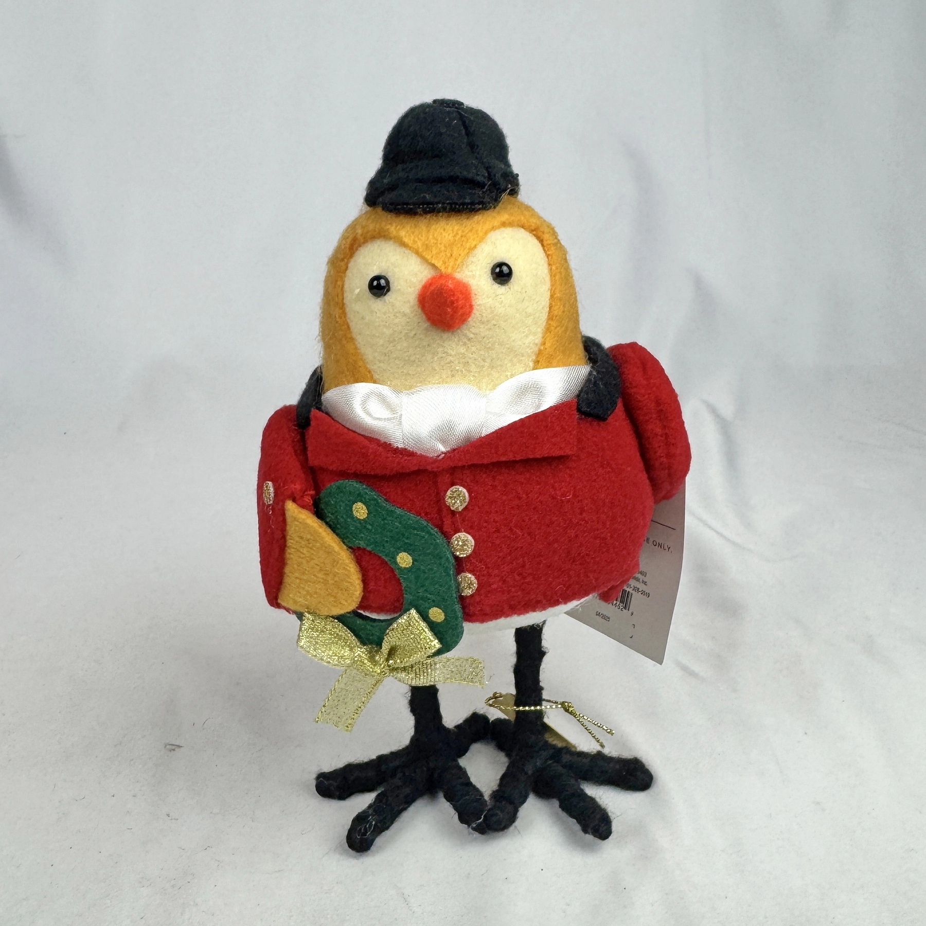 Add classic holiday charm with “Stirrup” from Target’s 2025 Wondershop Featherly Friends collection. This festive fabric bird wears a red coat with gold button details, black hat, and holds a green wreath accented with a gold bow. Freestanding and perfect for mantels, shelves, or tiered trays. Includes attached 2025 charm.