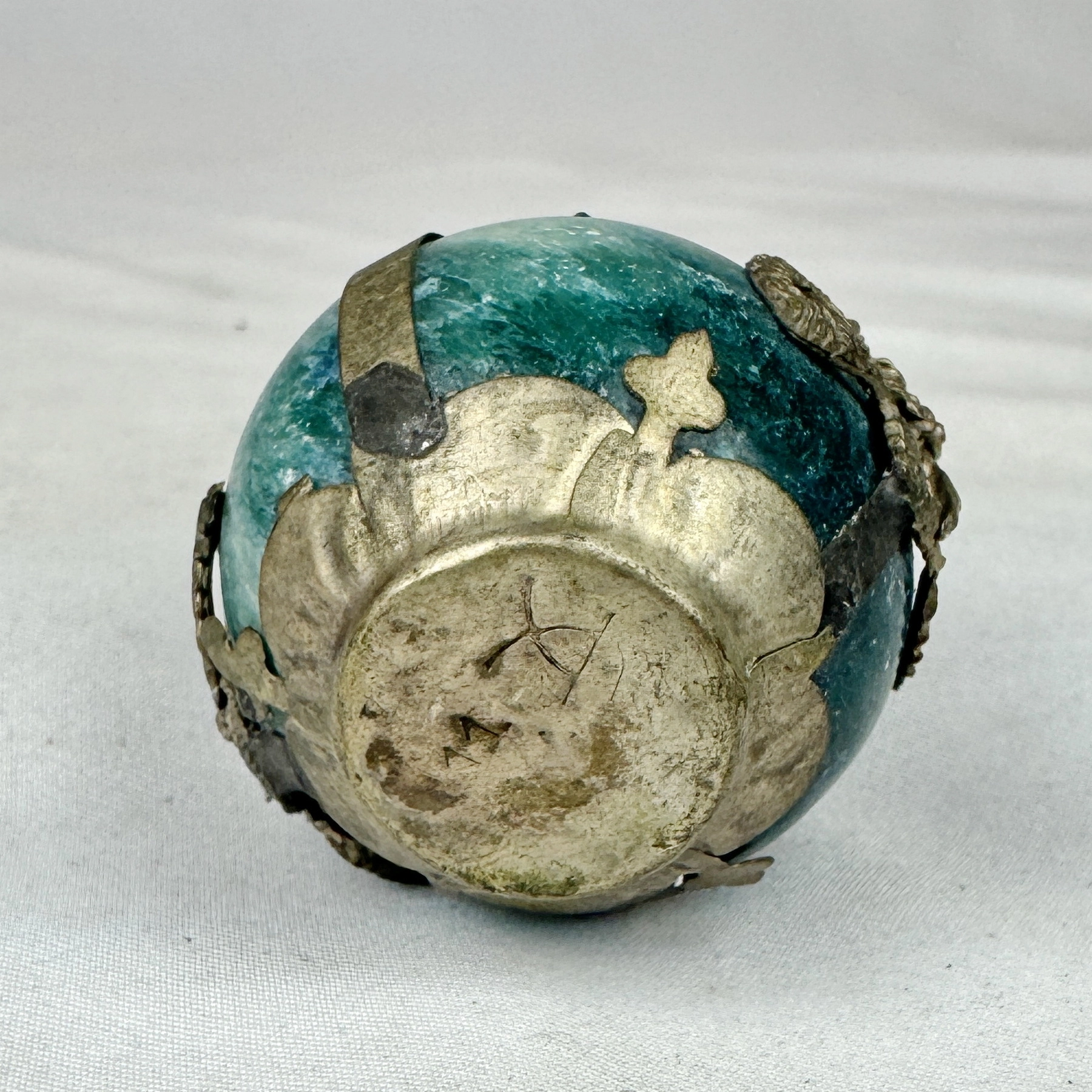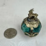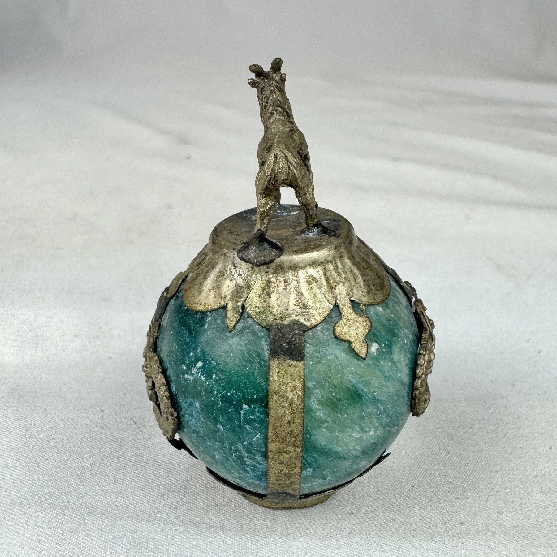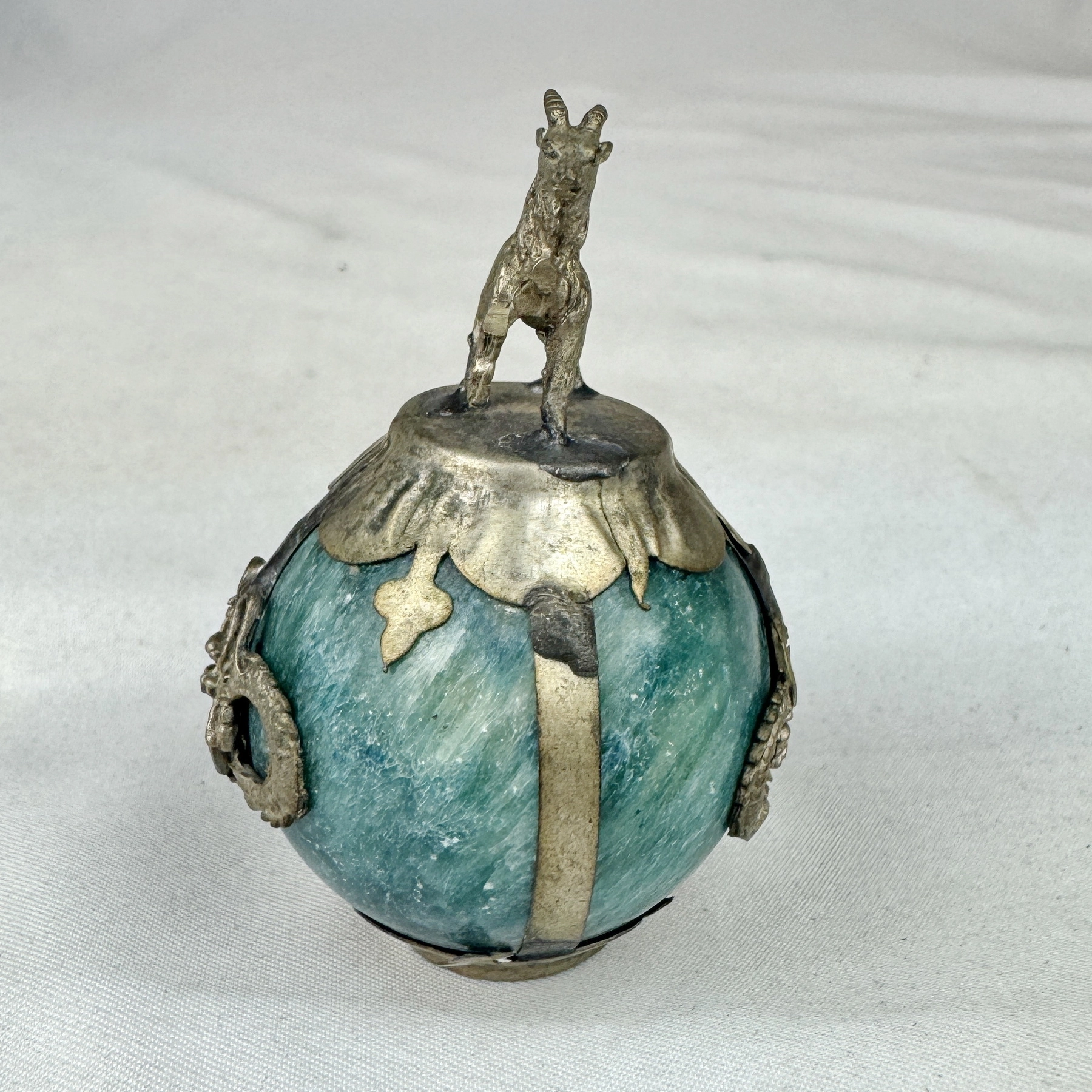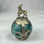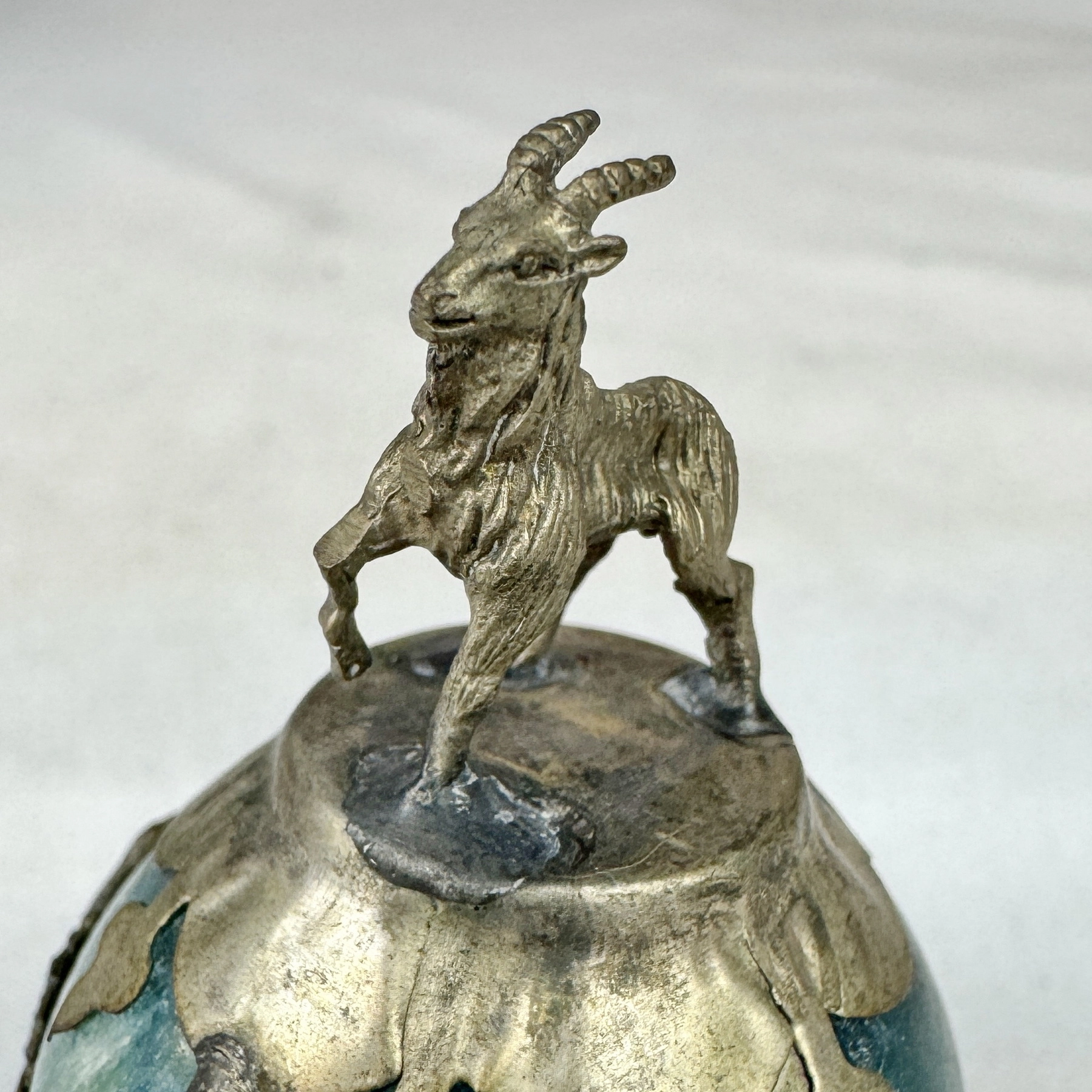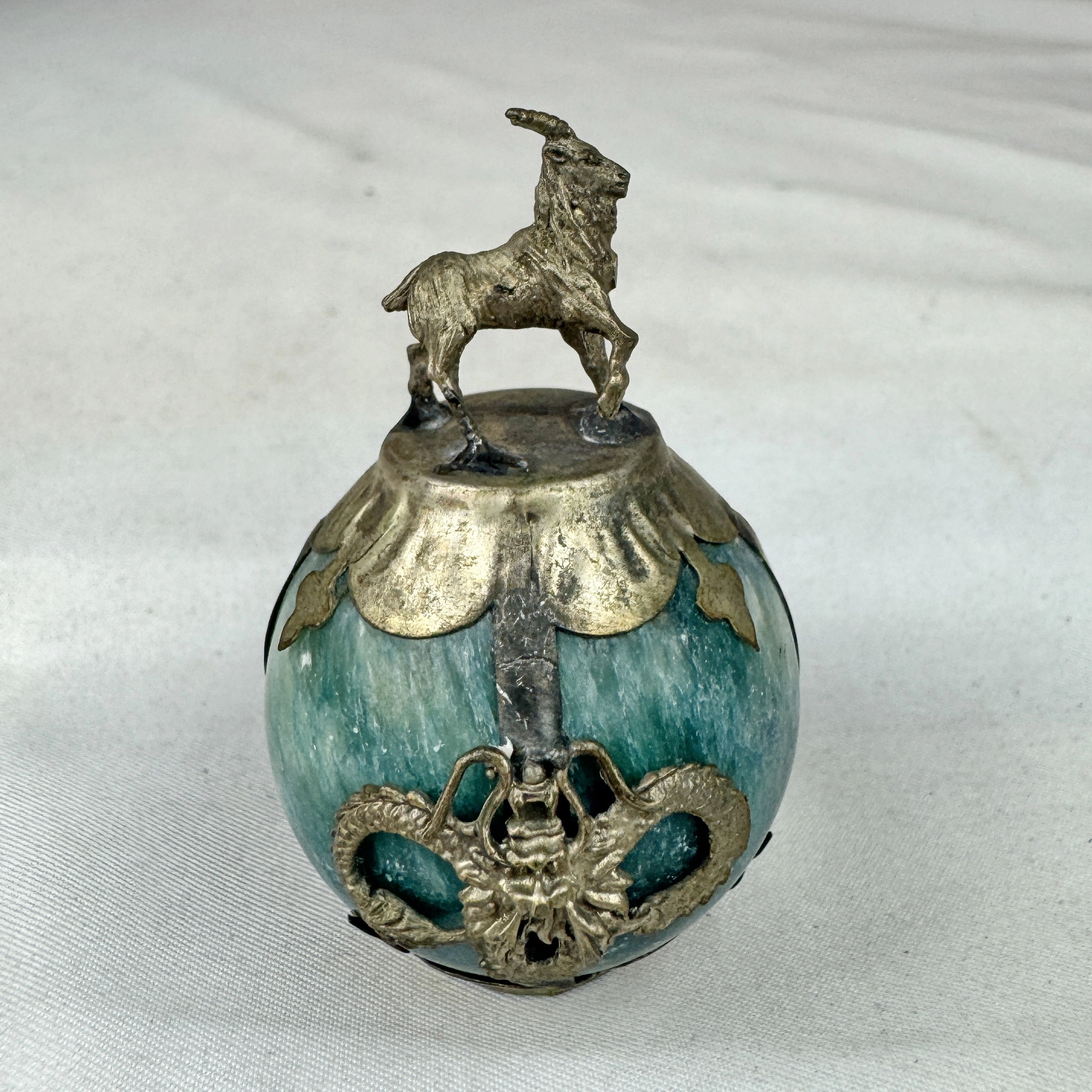 - Handcrafted sheep finial holding object, dragon reliefs, ornate floral pewter overlay