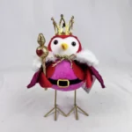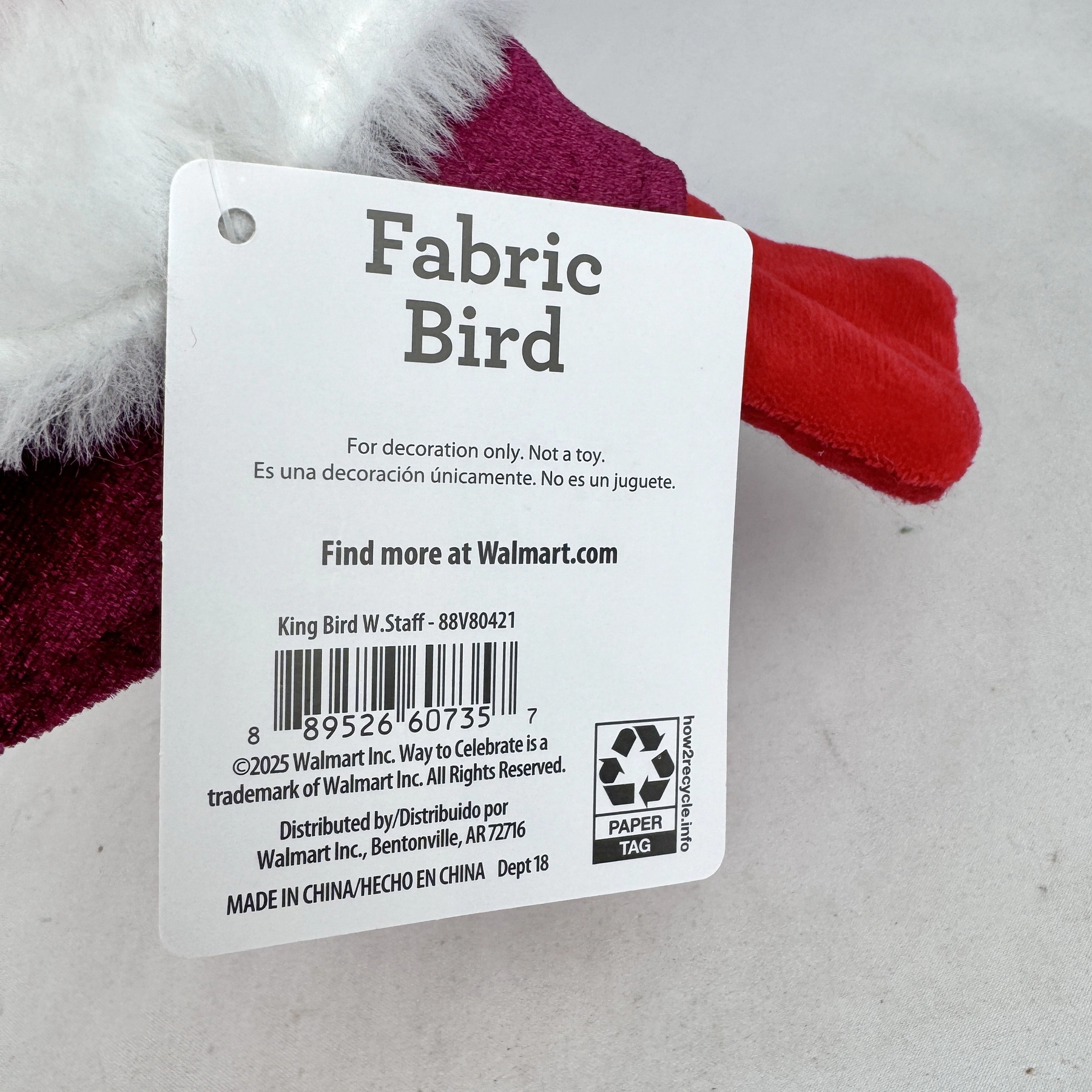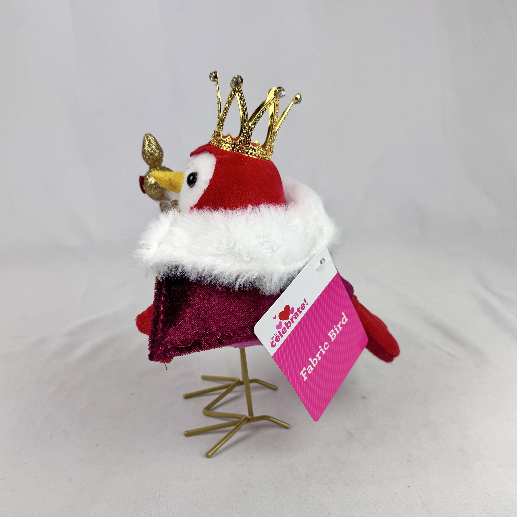 Festive 2026 Walmart “Way To Celebrate” Valentine King fabric bird featuring a gold-tone crown, glitter heart-topped staff, faux fur trimmed cape, and gold metal legs. A charming royal accent for Valentine’s Day tiered trays, mantels, or tabletop displays. Decorative use only.