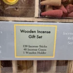 Gift set with 4 varieties of incense sticks, 2 varieties of incense cones and wooden holder. All nicely displayed in a wooden box.